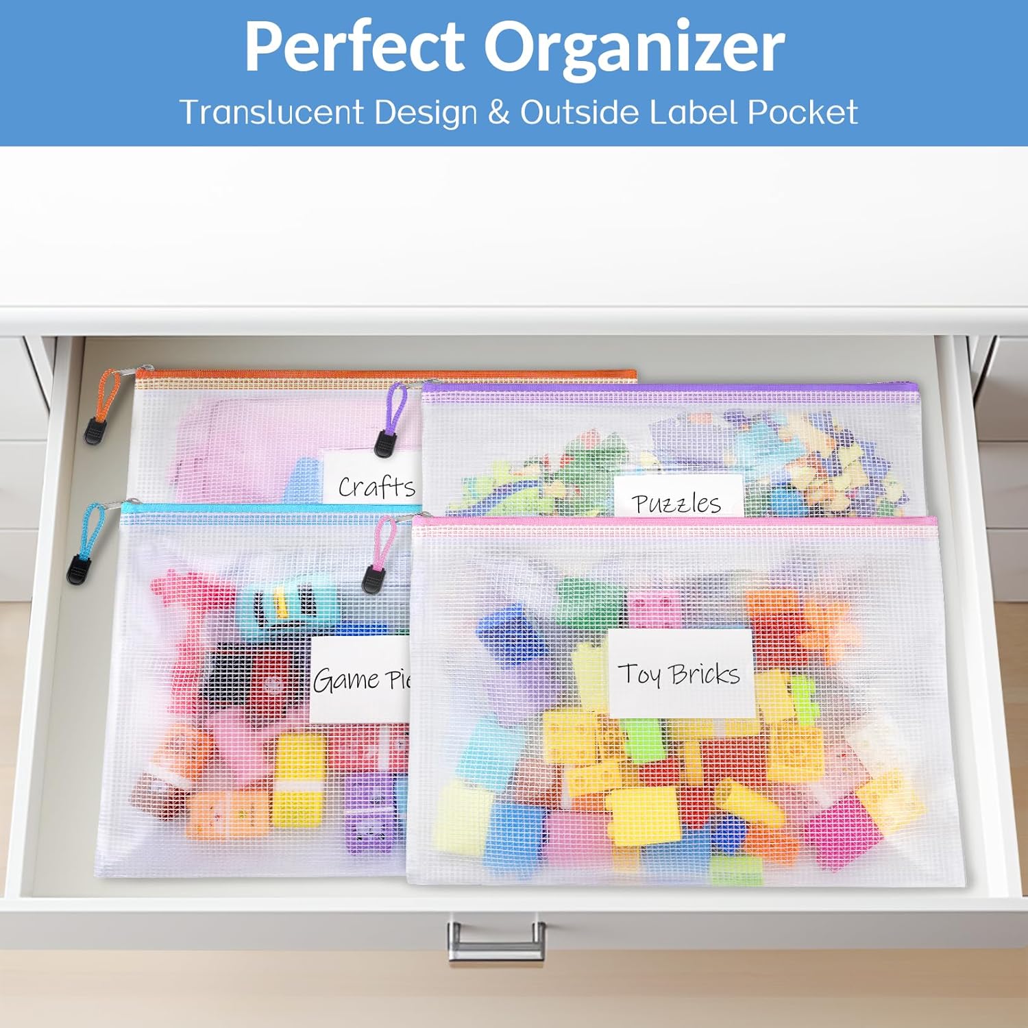 What You’ll Get: 24 pack mesh zipper pouch bags, B4 size, 15.6×11.2 inches, 12 assorted colors (each color with 2). Perfect for board games, all sizes of puzzle & crafts, letter-size documents, most game pieces, and other small parts around the house. Help tremendously to quickly and easily create more order in your life! It also features convenient size to chuck into baskets, closets, travel totes, beach bags and so much more!