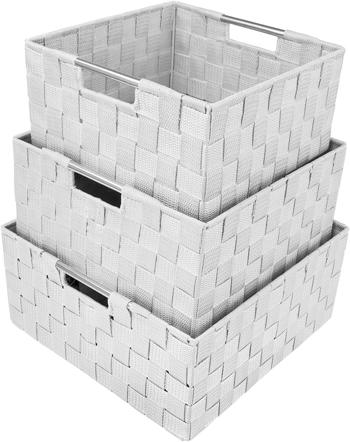 CLASSIC DESIGN — Decorative weave pattern — Made of durable polypropylene ribbon, with stainless steel tube frame to maintain shape over time — Integrated cut-out handles —Rinse with water to clean—Measures Approximately: XXX-Large: 12.50’’ x 12.50’’ x 6’’ — XX-Large: 11.75’’ x 11.75’’ x 5.75’’ — X-Large: 11’’ x 11’’ x 5.25’’