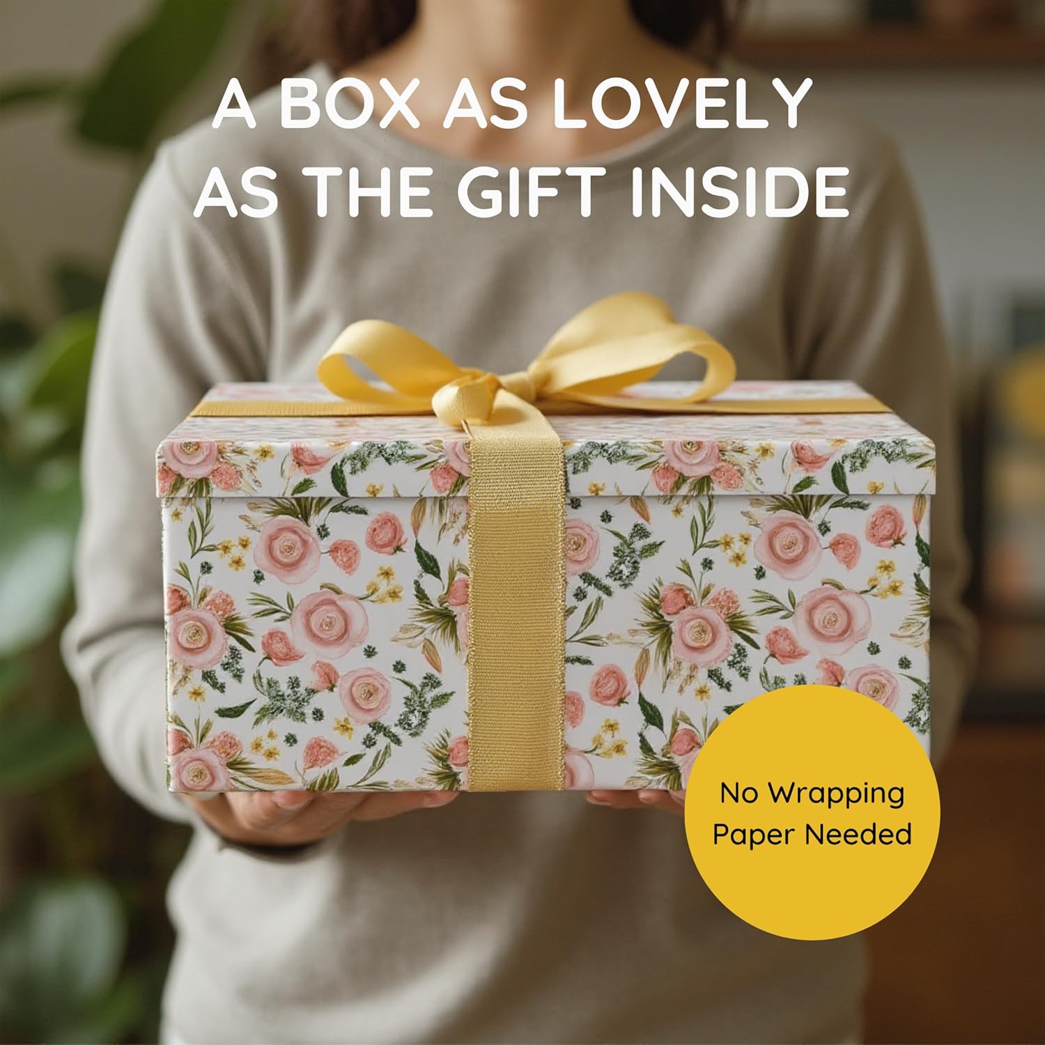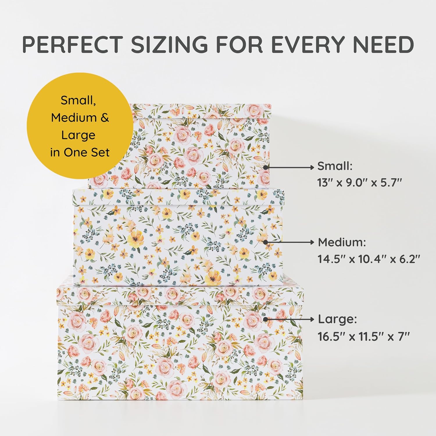 DURABLE CONSTRUCTION—Created using quality paperboard with a matt finish, these elegant boxes are solid and durable. Each size features a matching all-over floral design. Set includes one of each; Small: 13 inches x 9 inches x 5.7 inches, Medium: 14.5 inches x 10.4 inches x 6.3 inches, Large: 16.5 inches x 11.6 inches x 7 inches.