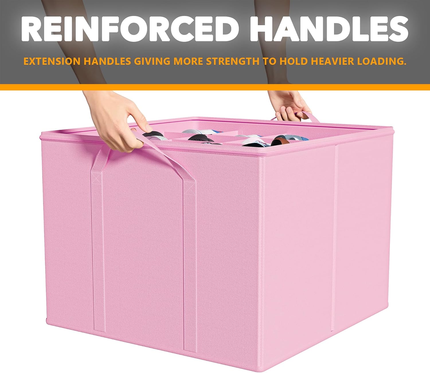 Strong Structure: Made form durable tear resistant non-woven fabric, sewn with thick stitches and supported by pp boards, the handles surround the box, giving the box much more strength to hold heavier loading than stitched handles.