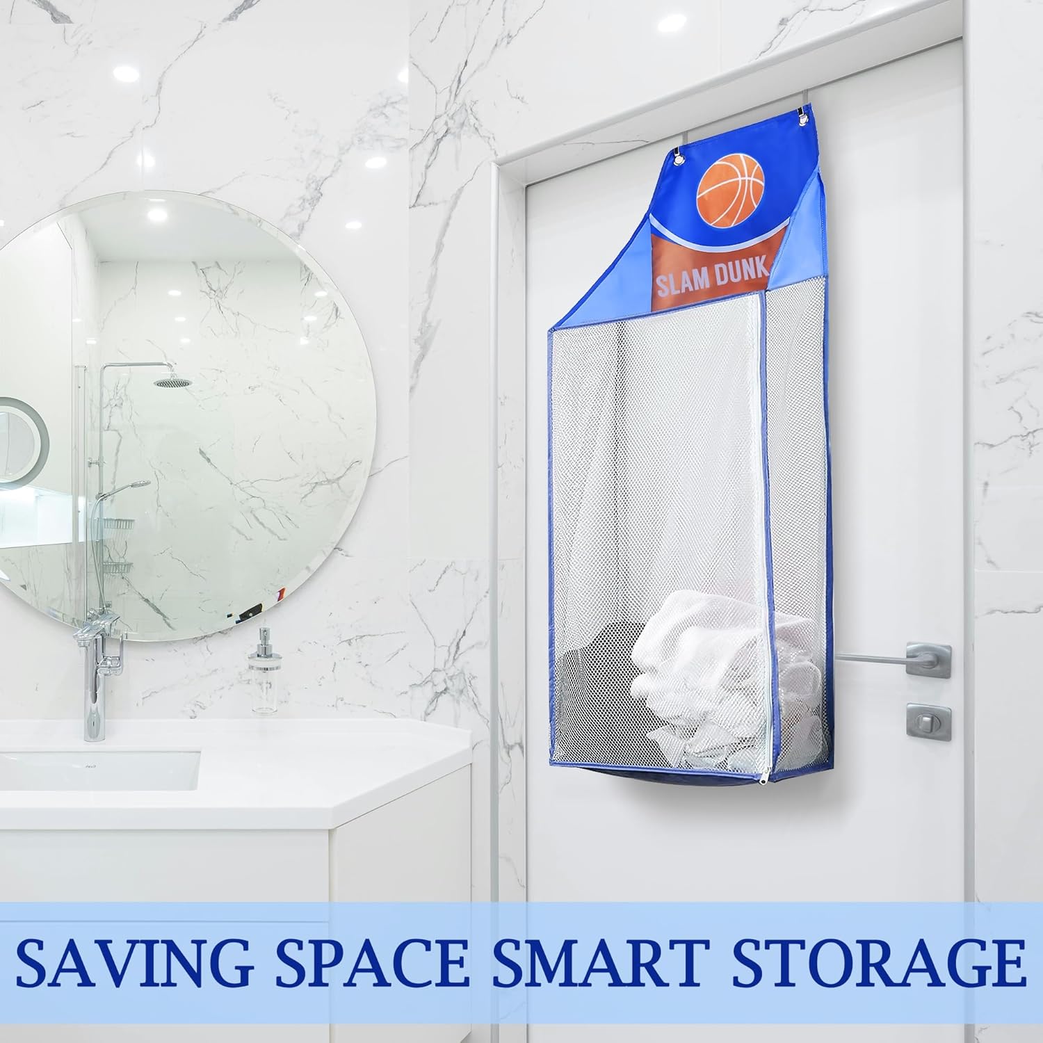 The Basketball Theme Over the Door Mesh Laundry Hamper – the perfect solution for efficient laundry storage in any space.This over the door laundry hamper hangs saving valuable floor space and keeping your room neat and organized.Its foldable design makes it ideal for travel, ensuring you can maintain your laundry routine wherever you go.The basketball laundry hamper adds a playful touch to your decor, making it a hit with basketball fans of all ages.Constructed with breathable mesh material, this door hamper allows for air circulation, preventing odors and maintaining freshness.The zippered closure provides easy access to your laundry, making it a breeze to deposit and retrieve clothes, toys, towels, and more.Equipped with a durable metal hook, this mesh laundry basket is simple to install and stays securely in place. Embrace both functionality and style with our basketball-themed over-the-door mesh laundry hamper – a versatile and fun storage solution for individuals of all ages.