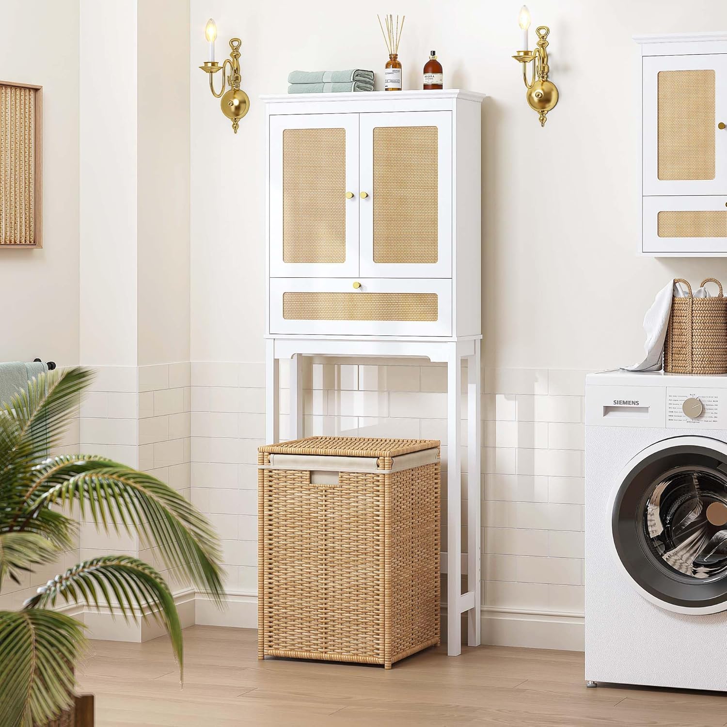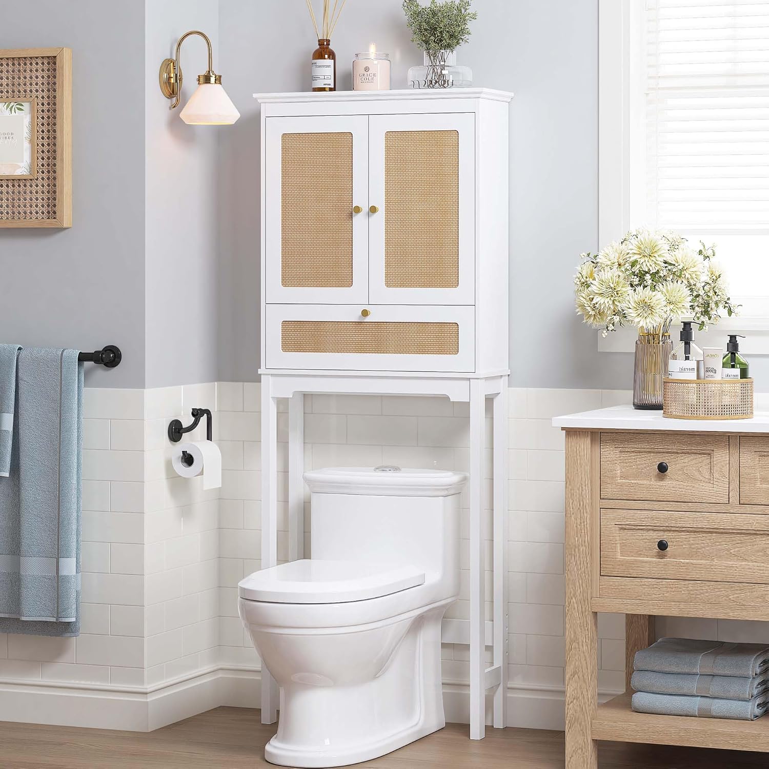 Organic Glam Design: Upgrade your bathroom with Spirich over the toilet storage cabinet featuring hand-woven PE rattan doors and gleaming golden knobs. This over the toilet shelf blends natural texture and modern elegance, transforming plain walls into a stylish focal point.