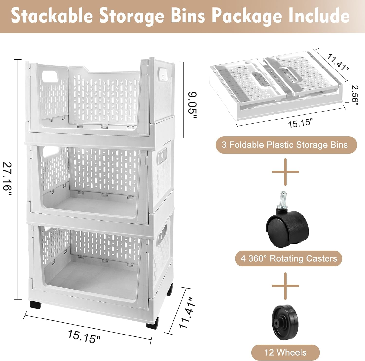 Stackable Plastic Storage Basket, 3 Pack Foldable Closet Organizers and Storage Bins with Wheels, Collapsible Drawer Shelf Storage Box Container for Office Bedroom Closet Wardrobe Kitchen Bathroom