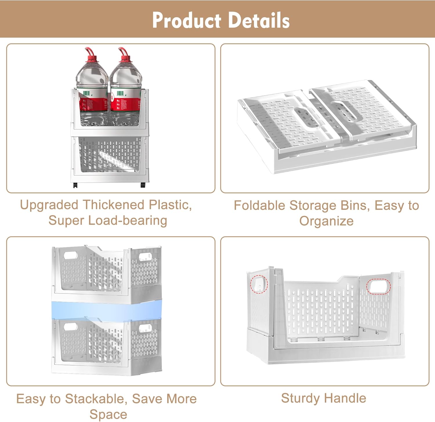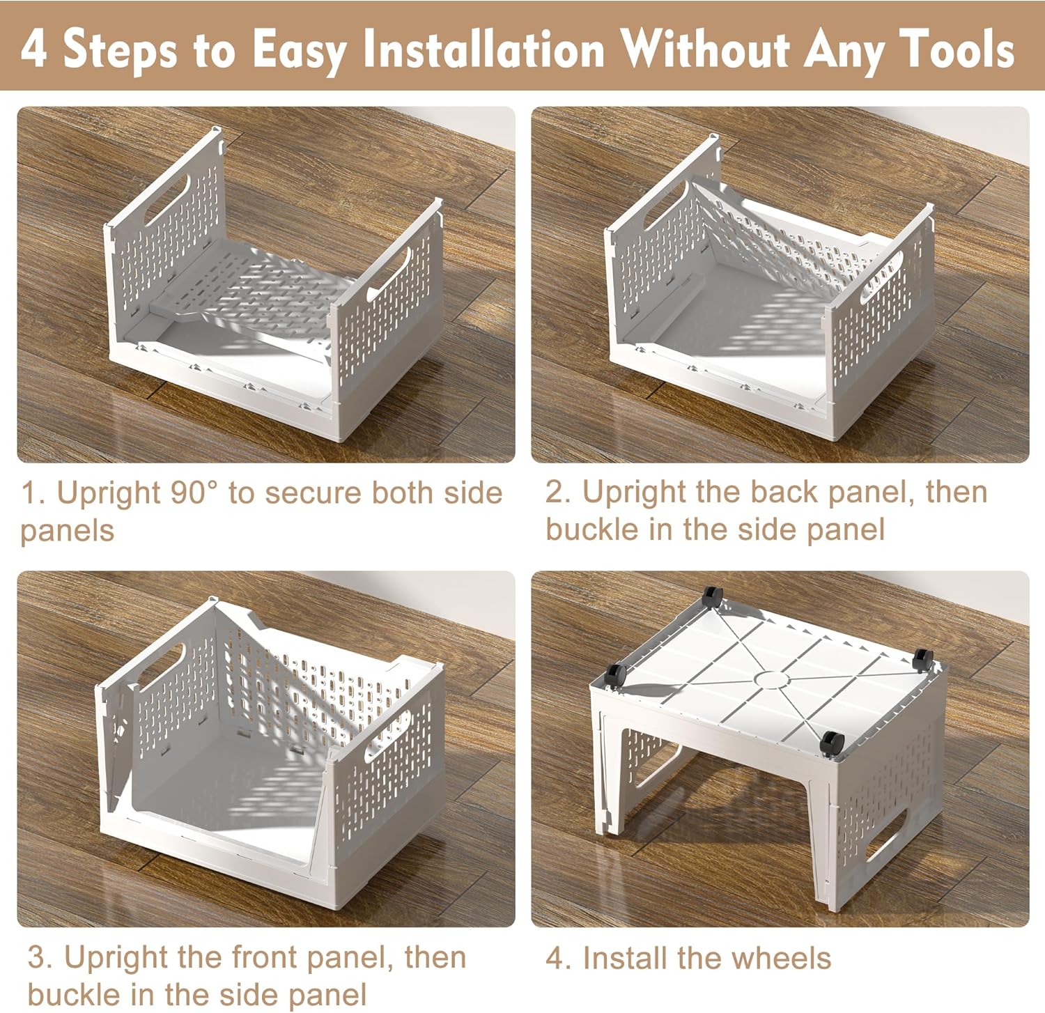 【Stackable & Removable】:The closet organizer storage box is made of thickened PP plastic, sturdy, lightweight but strong load-bearing, durable to extra last long. The plastic folding storage box can be used individually or stacked to fit your space or according to your needs. The snap design on both sides help to keep them from tipping over when stacked. Moreover, there are 4 360° rotating wheels on the bottom of the storage bins for easy moving