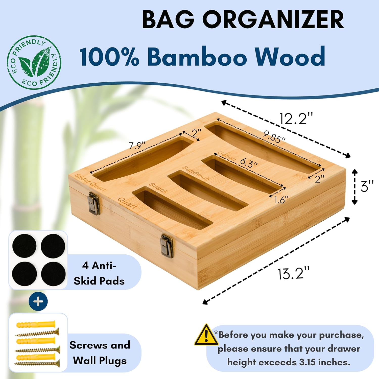 【Effortless Organization】 Keep your drawer tidy with our Bamboo Wood Organizer. This versatile kitchen drawer baggie organizer is designed specifically for the purpose of arranging your food storage bags. With its smooth surfaces and finely sanded curved edges, it offers comfort to both kids and adults during refilling. No more fumbling through a disorganized mess; our Bamboo Wood Bag Organizer makes it easy for you to access your bags without any hassle.