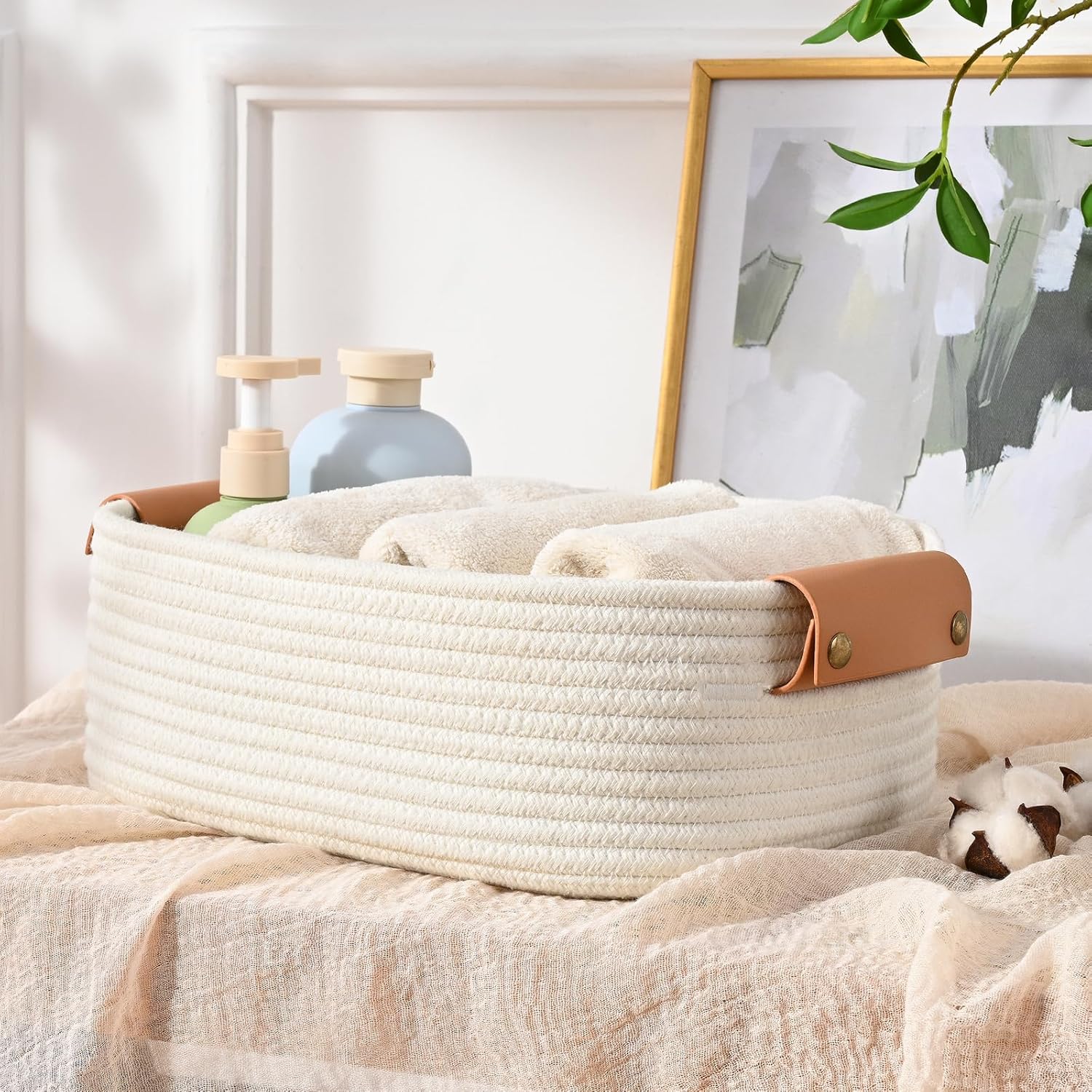 6 Storage Basket Set: This set includes 6 storage baskets: 4 with leather handles and the other 2 baskets (LEATHER HANDLES NOT INCLUDED). With its simple and versatile design, this storage basket set can be blended into multiple spaces seamlessly – living room, bedroom, bathroom, and beyond.