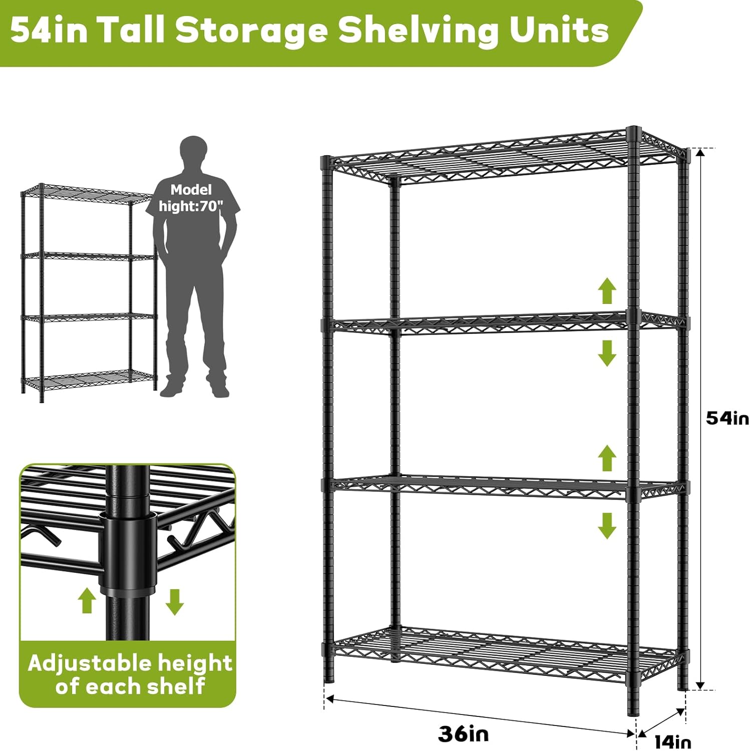 36″ L x 14″ W x 54″ H Wire Shelving: Our wire shelving racks measure 36″ L x 14″ W x 54″ H; This utility shelf effectively organizes your space and creates a tidy environment
