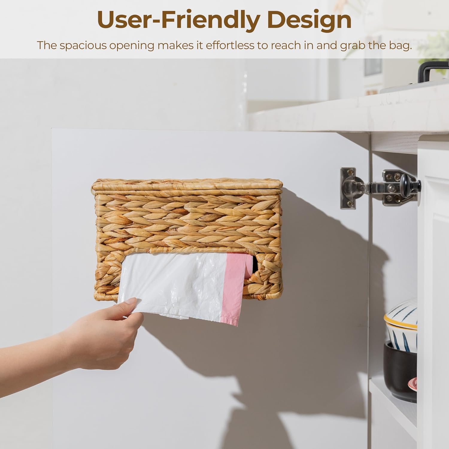 Built to Last: This eco-conscious garbage bag holder is crafted from natural water hyacinth and handwoven by skilled artisans. Durable design, lighter planet footprint.