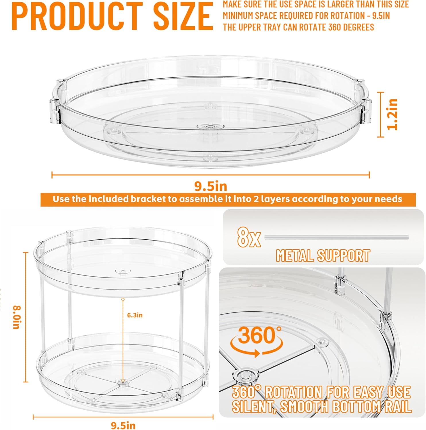 【Custom Installation Turntable Organizer】Include And 8Pcs pillars and 2 Pack 9.5 Inch plastic turntable lazy susans.You can insert the pillar as needed to assemble them into two layers,Or as two single-layer lazy Susans,our lazy susan makes the most out of every inch of your cabinets(2 layered interior height of 6.3 inches)