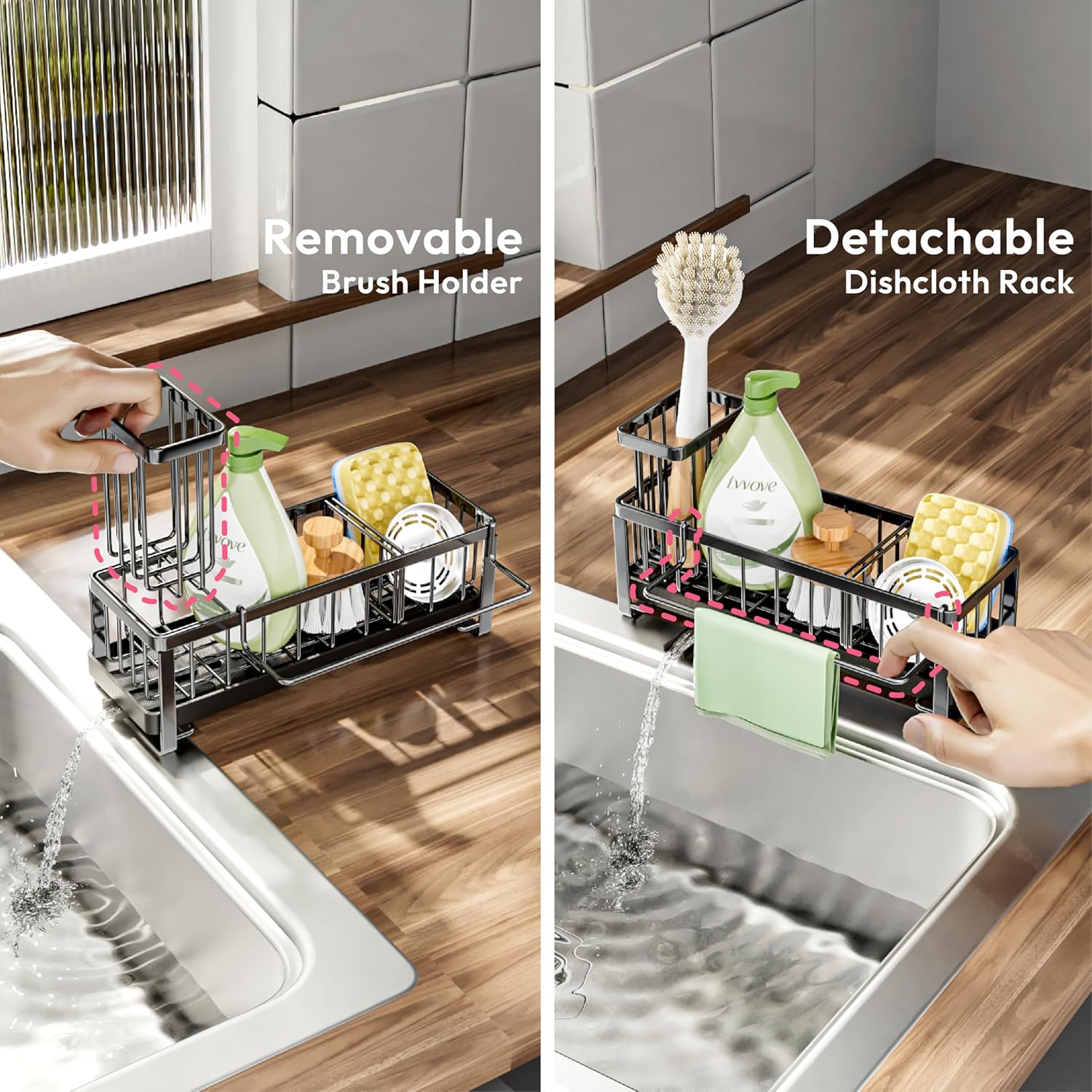 [Large Storage Space Kitchen Essentials]: Our kitchen sink caddy organizer will give you a neat and clean kitchen for its strong storage capacity. Soap holder can hold three brushes, one rubber plug and a sponge, one bottle of soap dispenser-no swinging and no falling