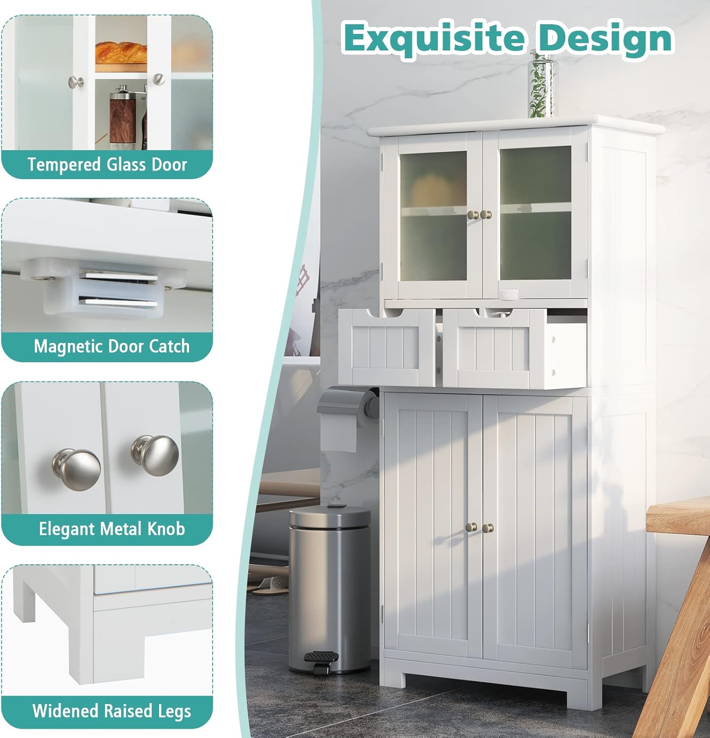 [Built for Lasting Use]: The main body of the floor cabinet is made of premium MDF, which features excellent wear-resistance and sturdiness. Besides, the surface is painted to ensure easier maintenance. And the door of the upper 2-tier medium cabinet is made of durable tempered glass.