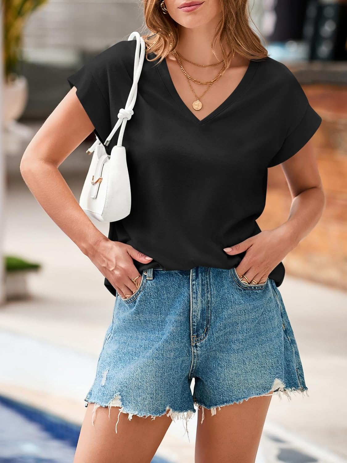 Womens T Shirts V Neck Short Sleeve Casual Loose Tees Tops 2025 Trendy Clothings