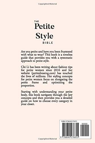 Are you petite and have you been frustrated with what to wear? This book is a timeless guide that provides you with a systematic approach to petite style. Being petite (5’2″) herself, Chi Li has been writing about fashion tips for short women since 2016 and her website petitedressing.com has touched the lives of millions. Her styling concepts for petite women focus on elongating the petite frame and optimizing the proportion.Many talk about how hard it is to find petite clothing that fits, but few understands fit is just the first step to building the petite wardrobe. Because petites have shorter frame, it is critical for short women to be conscious and selective of everything they put on. Fit and flattering are the two parts of the equation that both are important. The styling goal for petite women should be to create a long and lean silhouette that elongates and flatters their frame.Starting with understanding your petite body, this book navigates through the key styling concepts and then provides you with a detailed guide on how to choose every category in your closet. After reading this book, you will grasp the key styling principals on how to make everything look flattering on a short woman, which you can immediately use for your everyday style solution. Each season when you are deciding what you need to add to your closet, come back to this book and you may find the answer. This book also provides you specific guidelines on how to choose every category of clothing as a short woman, covering jeans, pants, dresses, jumpsuits, tops, skirts, coats, shoes and accessories. With these guidance, you will never struggle with what to wear as a petite woman.