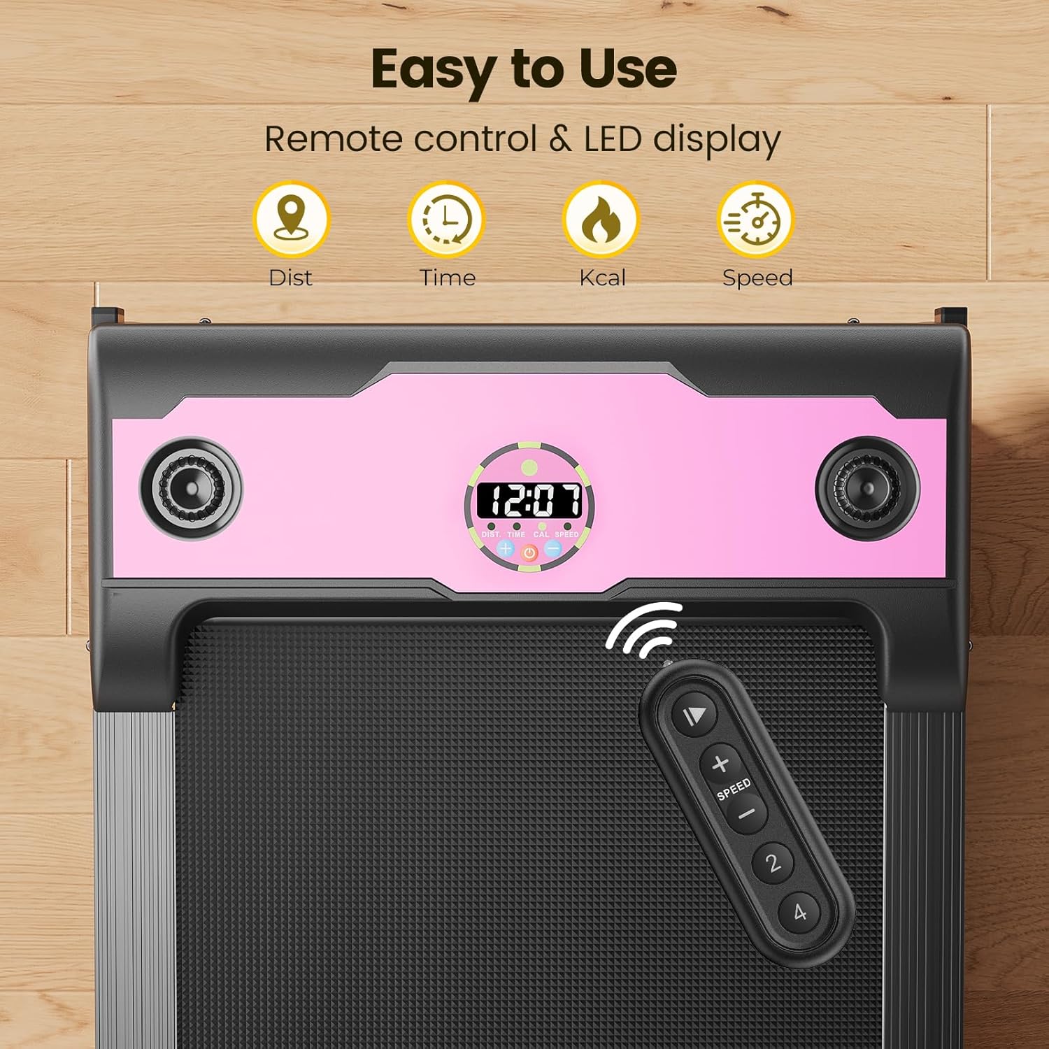 Hassle-Free Use: Featuring a remote control, this home treadmill allows you to swiftly adjust the speed and easily start or pause your workout without needing to bend over; The HD LED display makes it simple to track time, calories, speed, and distance