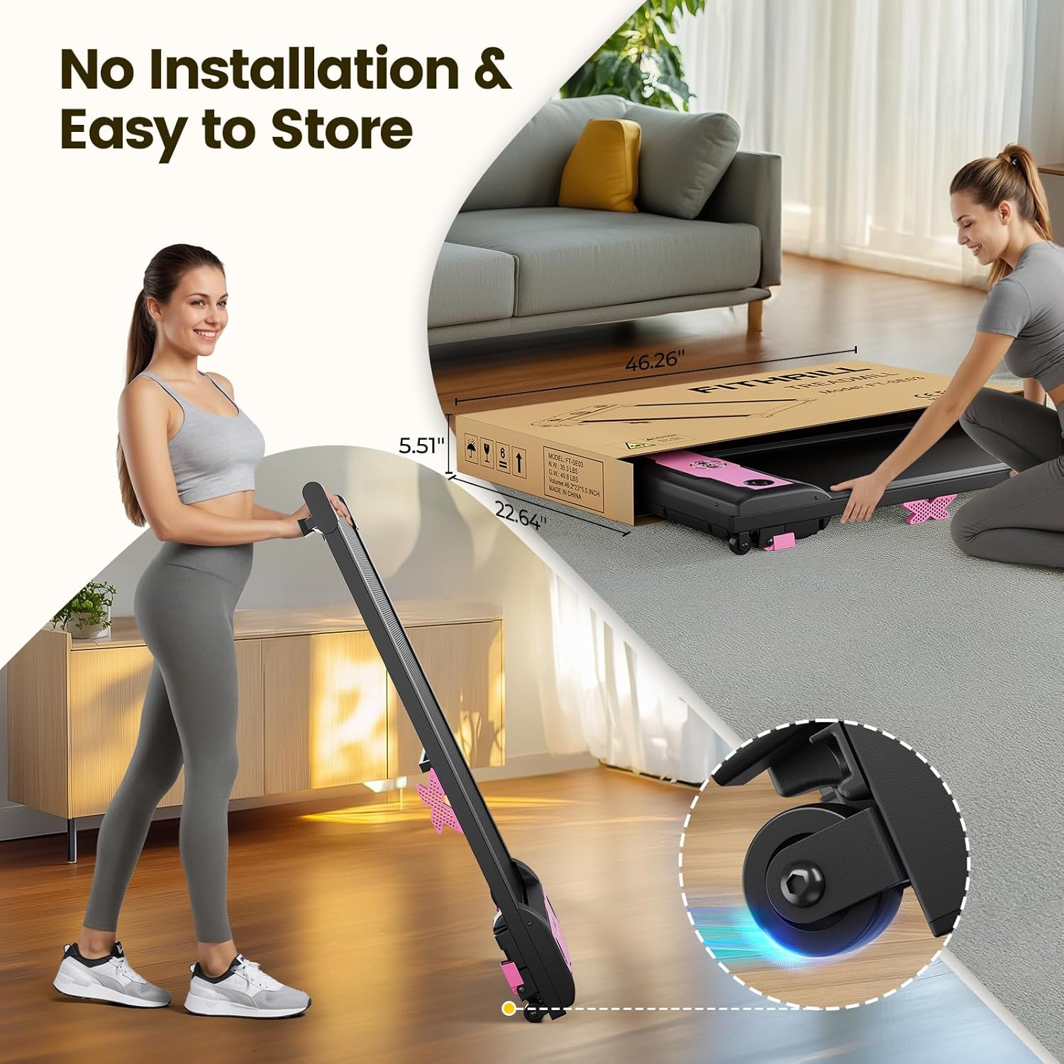 No Installation & Easy Storage: TINEF small walking treadmill is ready to use right out of the box, no assembly required; It comes with wheels for easy mobility; Its compact size can be stored under the sofa or under the bed