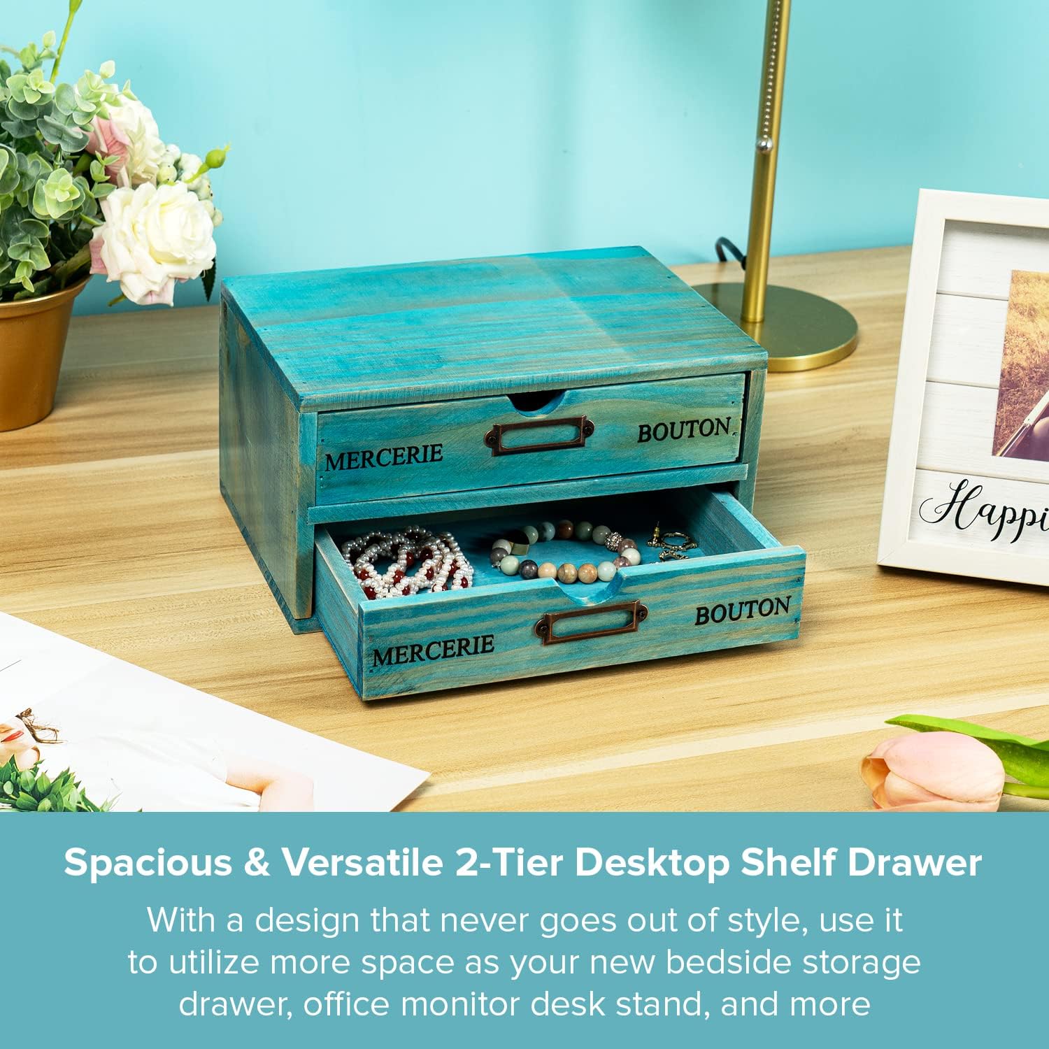 Turquoise 2-Tier Drawer Unit – European Country Style Desk Organizer Box – 9.7x7x5.1″ Teal Wooden Stackable Drawers – Countertop Organizer Drawers w/Label Holder – Double File Drawer Unit