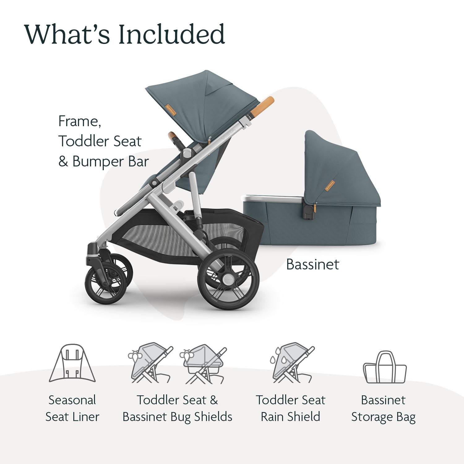 BUNDLE INCLUDES: Vista V3 Stroller, Bassinet V3, Bug Shields for Toddler Seat and Bassinet V3, Toddler Seat Rain Shield