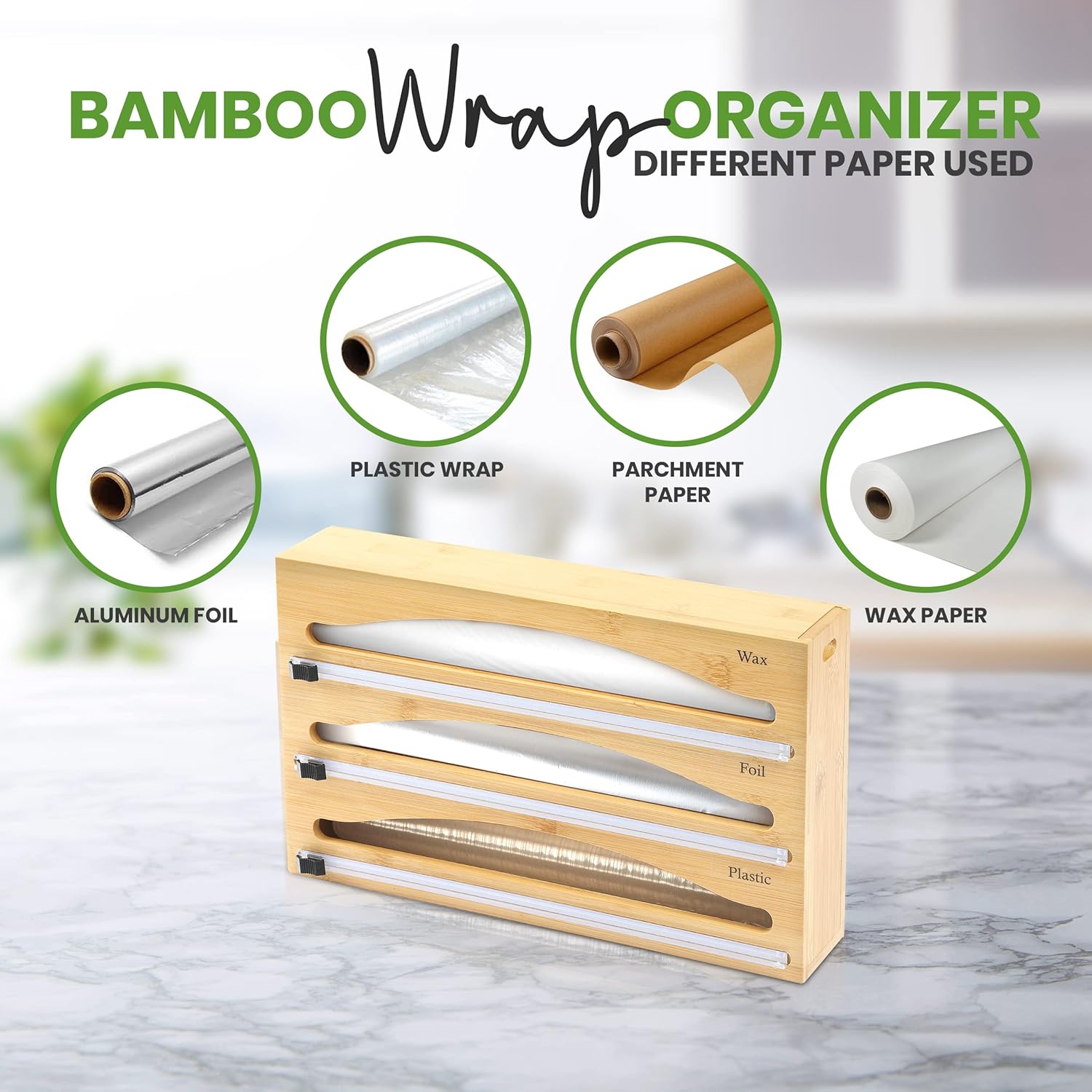 Utopia Kitchen 3 in 1 Foil and Plastic Wrap Organizer, Plastic Wrap Dispenser with Cutter, Bamboo Dispenser for Kitchen Organization and Storage – Fits 12 Inch Rolls – Natural