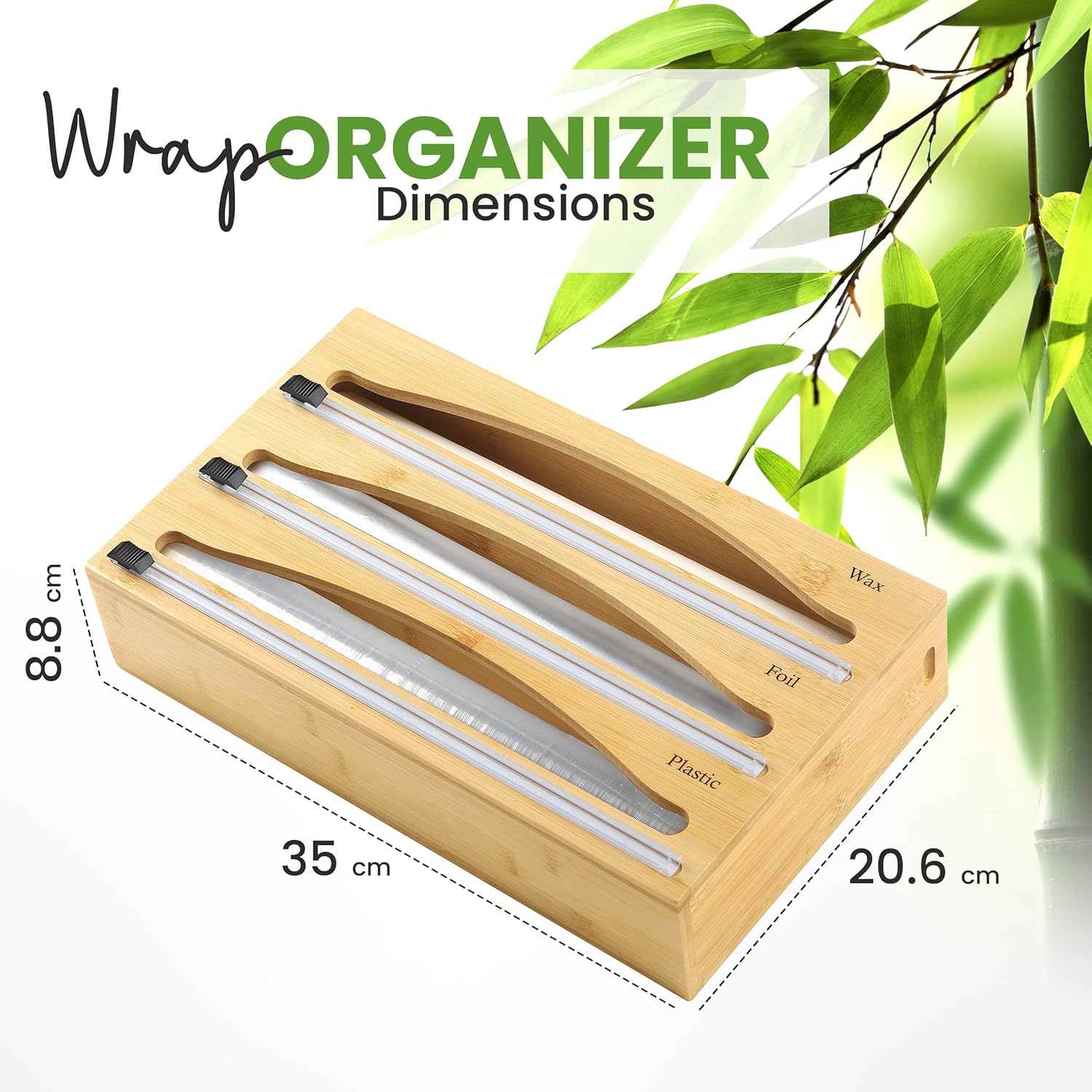 BAMBOO KITCHEN WRAP ORGANIZER- The foil and plastic wrap organizer is manufactured from premium quality bamboo wood. It is strong, durable, eco-friendlier, and easier to handle than any plastic, and metallic organizer.