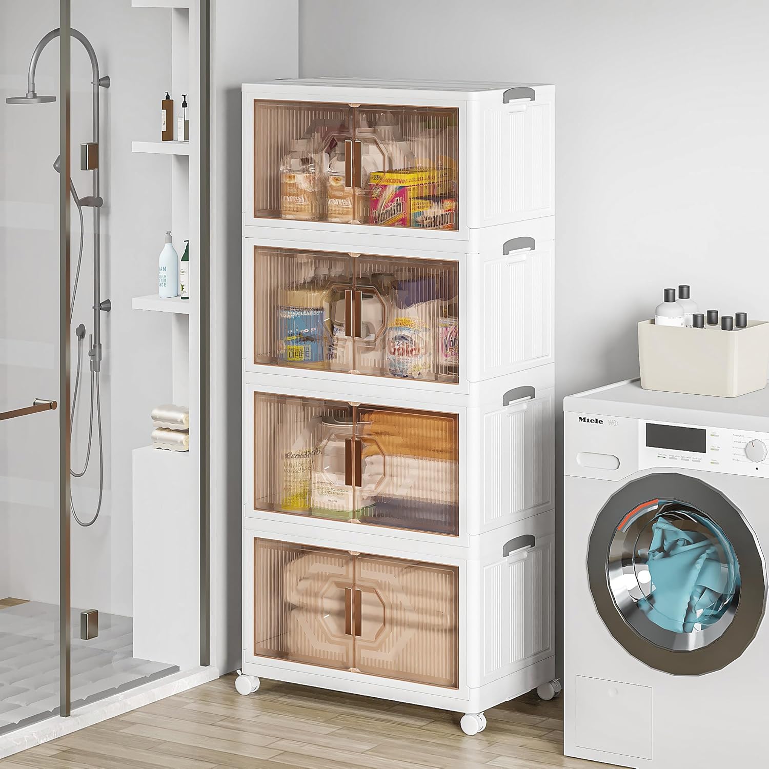 【Two Opening Methods】The wheeled folding storage cabinet can be opened in two ways—either through the top lid or the front door. The magnetic lock dual-opening doors, coupled with transparent windows, facilitates easy organization and access while preventing dust. The charming rectangular door of the foldable storage box adds a modern and stylish touch to your home decor.