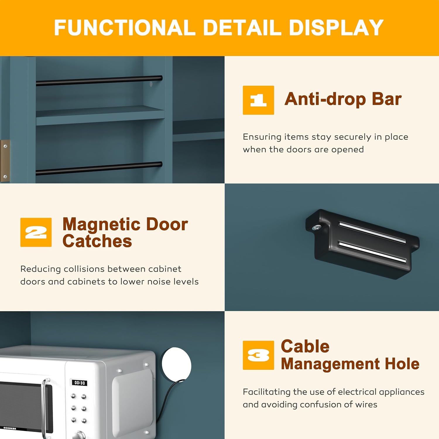 For More Stability And Security: Built with high-quality materials, ensuring durability and longevity for years of reliable use. The anti-toppling system (included) helps you fix the kitchen storage cabinet to the wall, and making it more safe and secure