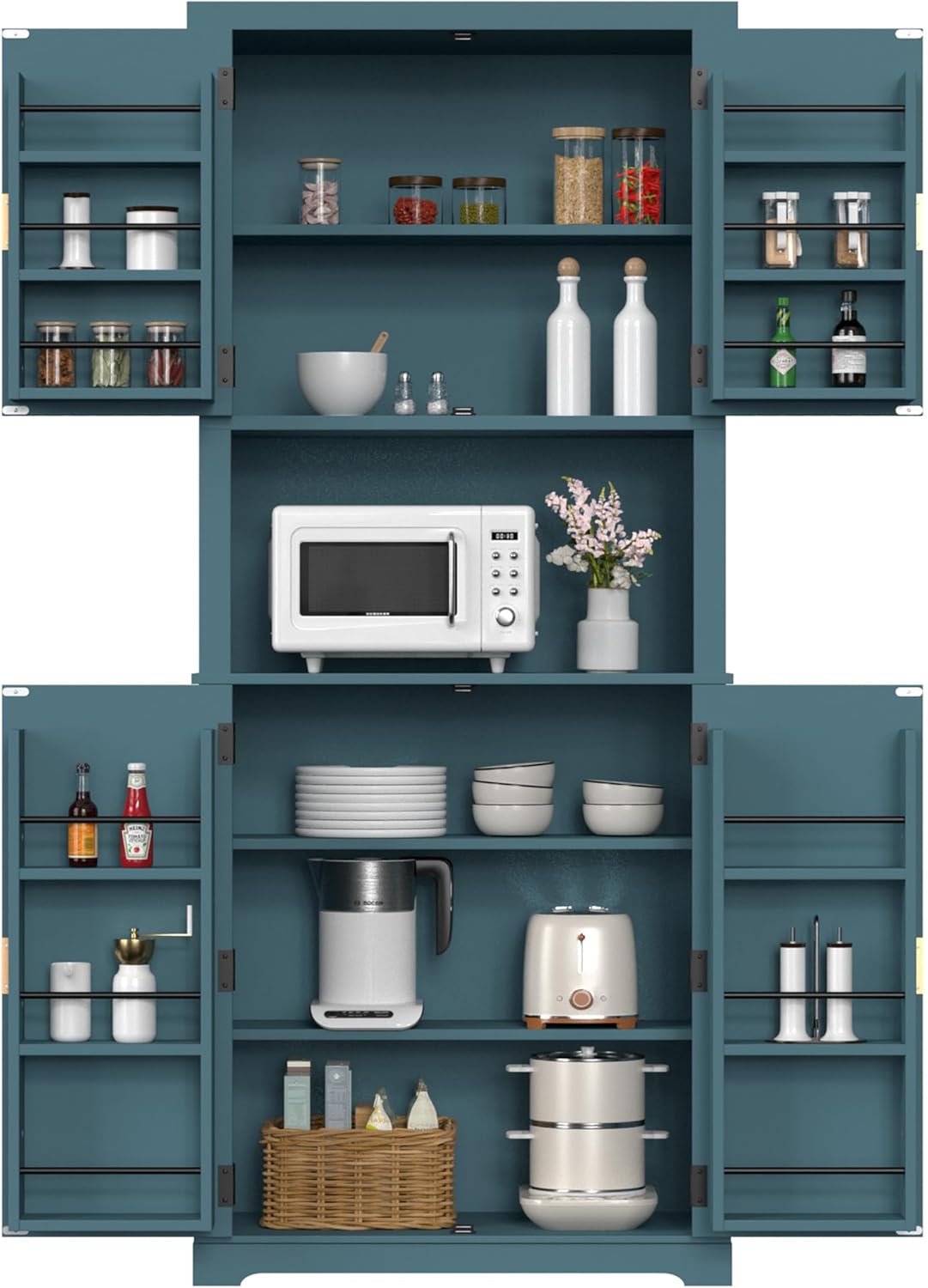 Huge Storage Capacity: The blue kitchen pantry cabinet has 2 levels of fixed shelves and 1 adjustable shelf, which can be adjusted according to your habits and needs. Boasting a big microwave stand and 12 door shelves, this spacious pantry fits everything from your food and dinnerware to kitchen appliances, tidying up wherever you set it