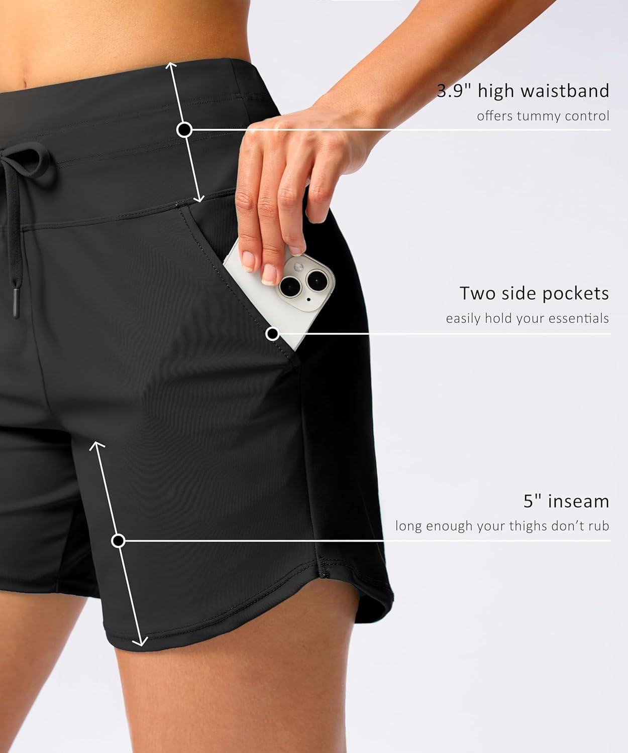 Womens board shorts offer tummy control with a stretchy elastic waist for an extra secure fit.