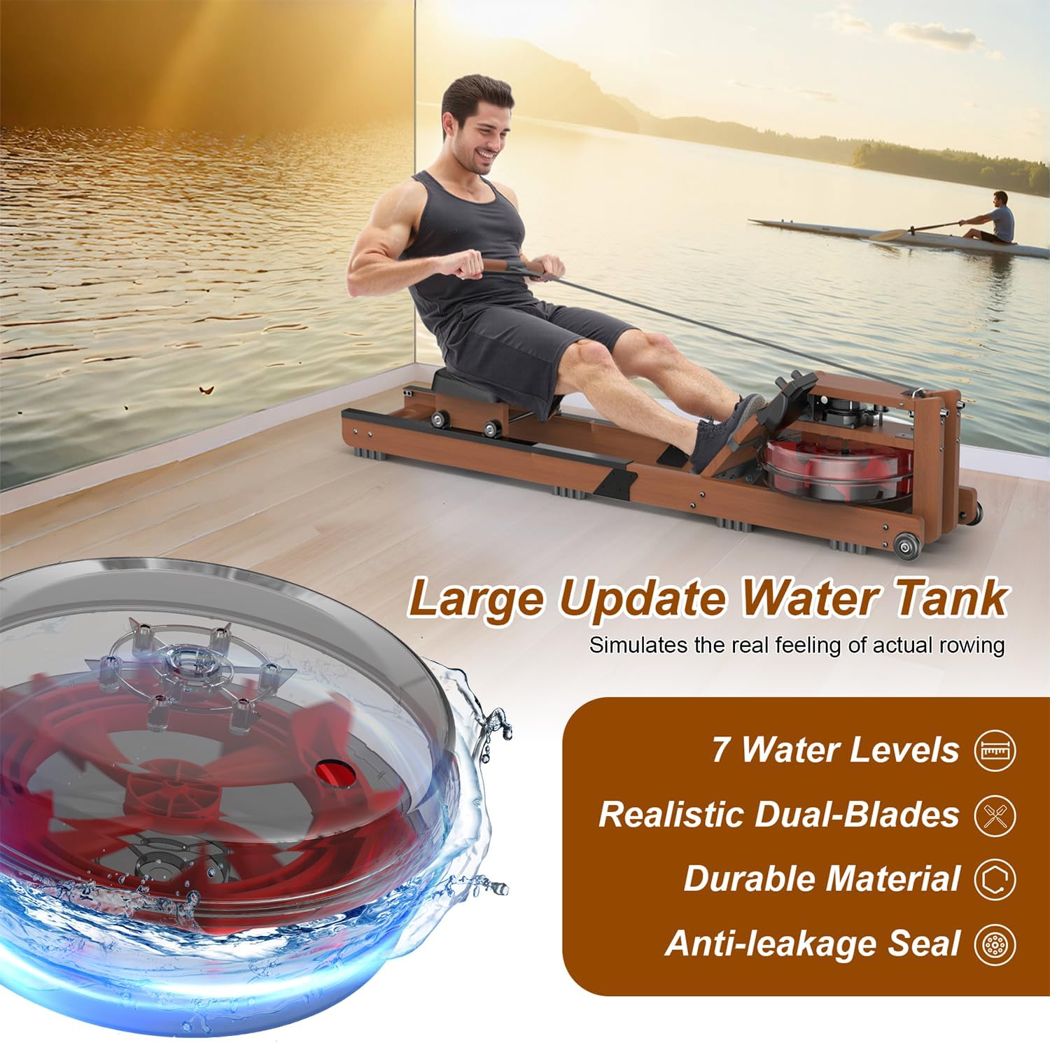 EXCELLENT DESIGH WITH PREMIUM NATURAL MATERIAL-The shape of the Rowing Machine is professionally designed like a real ship,and the real water resistance will perfectly bring you a feeling of real-life outdoor rowing experience.The real zebrawood makes the machine firmness and durability.Please note that the wood might have natural grains and slight color differences.
