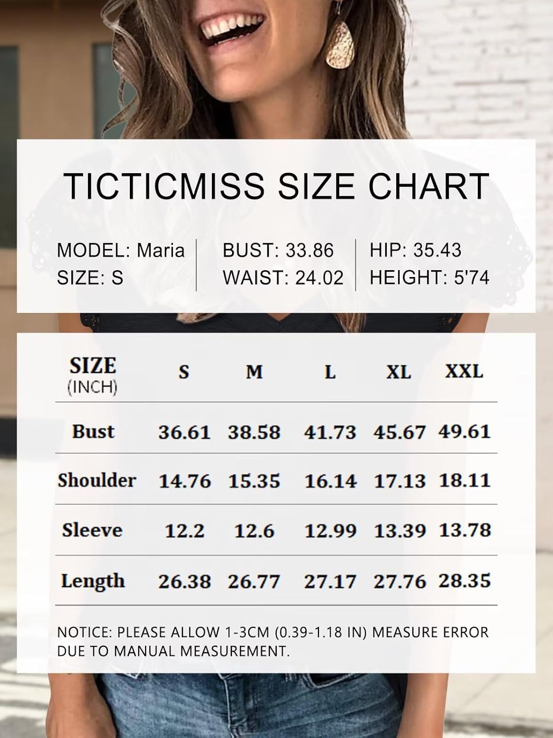 TICTICMISS Women’s Lace Short Sleeve Tops V Neck T Shirts Casual Dressy Summer Blouses Material: Polyester, Cotton, Spandex; Lace sleeve shirts is made of high quality fabric, super soft, stretchy, breathable, and skin friendly