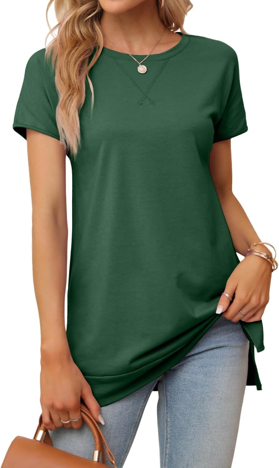 Casual fitBasic solid colorSide slits at hemclassic crew necksummer is not boringSoft and comfortable fabricNeckline Embroidery DesignClassic Summer Short SleeveSimple and classic solid color slit tee for a bright feel
