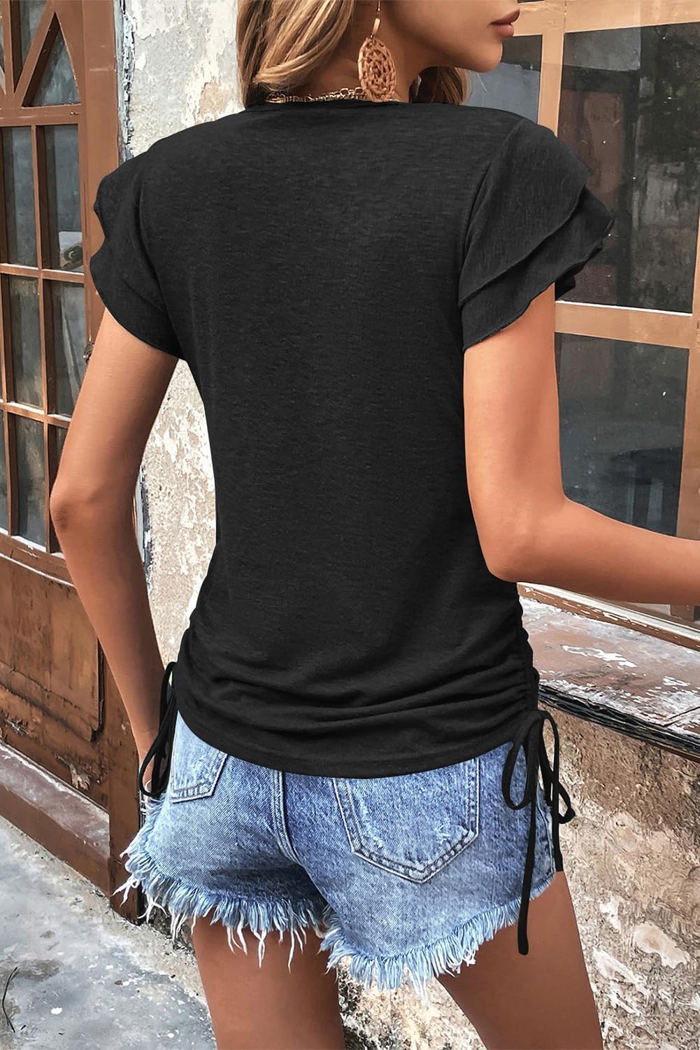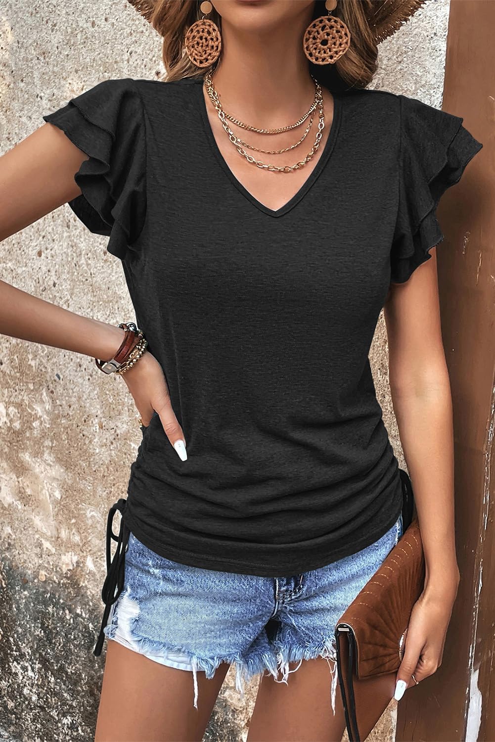 Womens Summer Tops Ruffle Short Sleeve Side Tie Drawstring V Neck T-Shirts Solid Color Casual Tunic Blouses Shirts