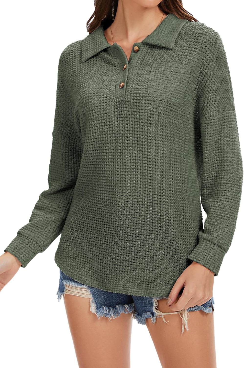 Womens Tops Waffle Knit V-Neck Long Sleeve T-shirts Button Down with Pockets Tunic Fashion Clothing