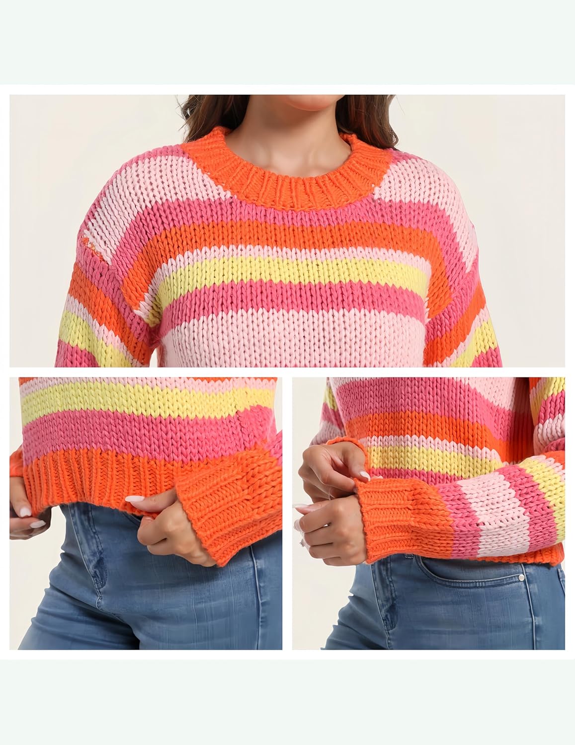 Womens Warm Sweaters Striped Color Block Cropped Pullover Fall Winter Knitted Top