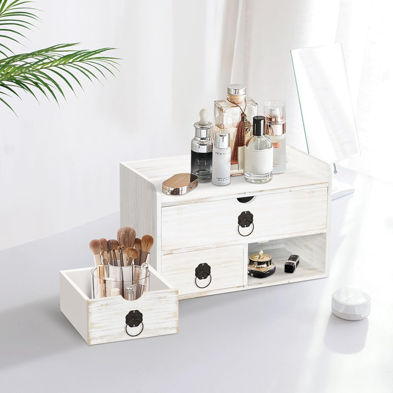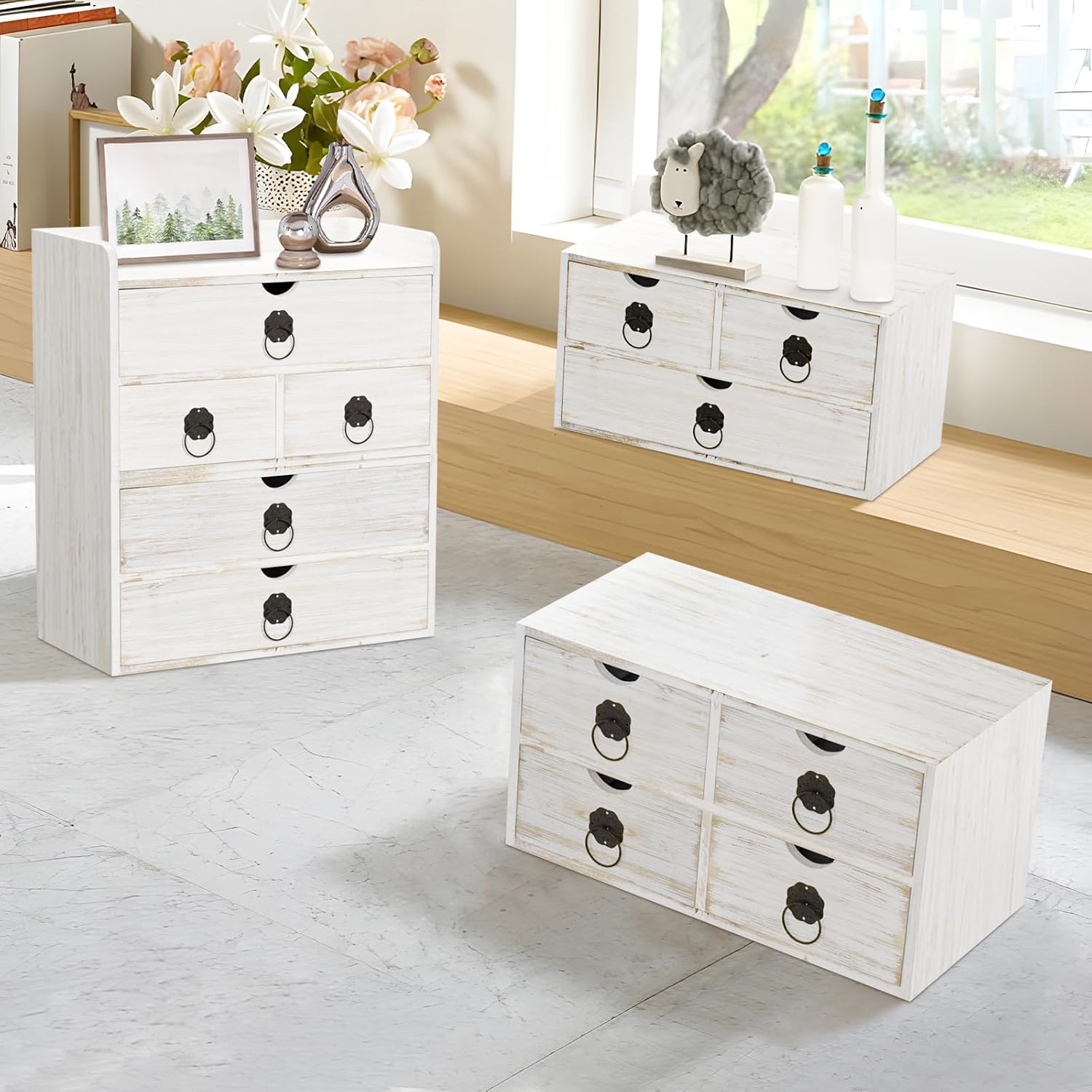 [FARMHOUSE VINTAGE DESIGN]: The wood desktop drawer organizer has a unique washed white appearance with a wood grain finish. The vintage rustic design is closer to nature and can fit well into modern or traditional style decor, bringing a classic atmosphere to your room.