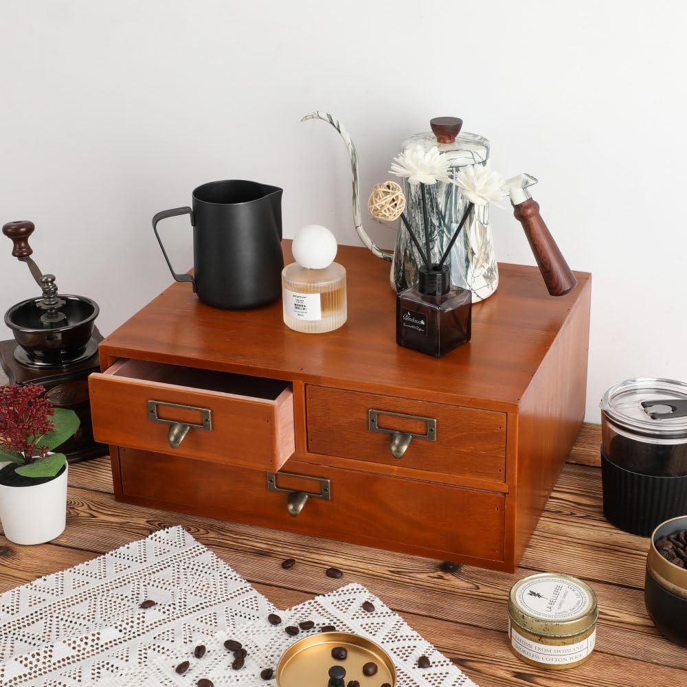 Wooden Storage Box with 3 Drawers Apothecary Drawers Vintage Wooden Drawers Wood Desktop Organizer with Drawers Countertop Drawers Library Card Catalog Cabinet Apothecary Cabinet(BROWN)