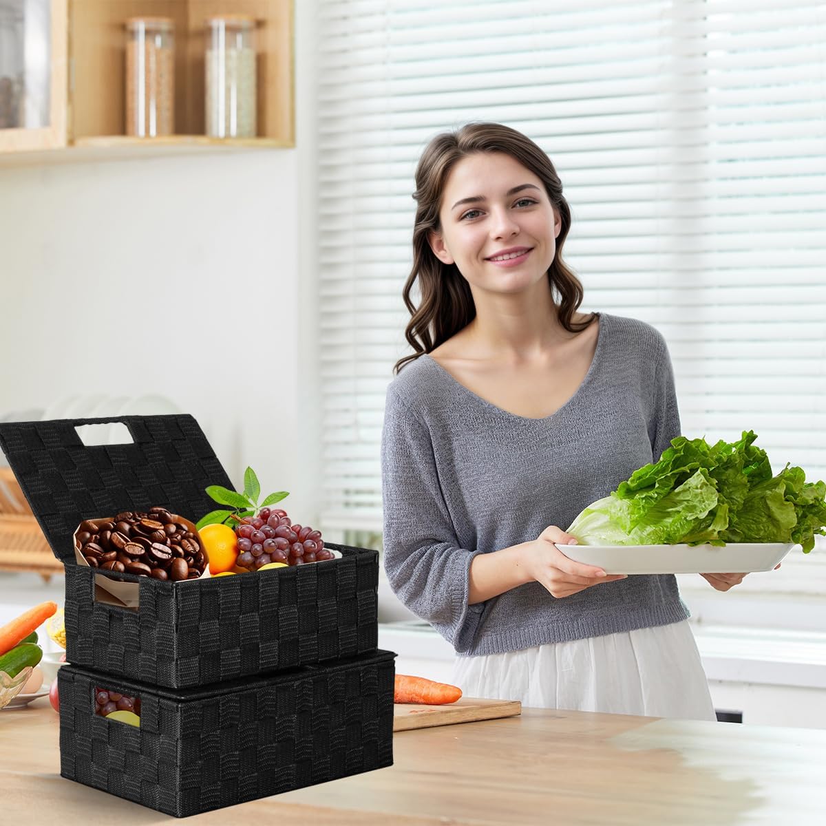 4 Different Sizes Baskets: 1 piece (with Lid) – 13.4 x 9.4 x 5.3 inches, 1 piece (with Lid) – 12.6 x 8.7 x 4.9 inches, 1 piece (with Lid) – 12 x 7.9 x 4.5 inches, 2 pieces (without Lid) – 7 x 5.3 x 3.9 inches. Multiple-sized woven baskets are suitable for different items and fit perfectly on many shelves, making them versatile for various purpos