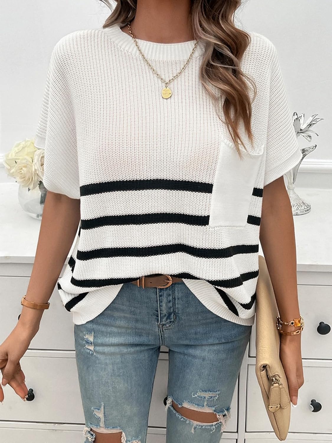 Wowcarbazole Women’s Cap Sleeve Crew Neck Striped Color Block Casual Sweater Shirts