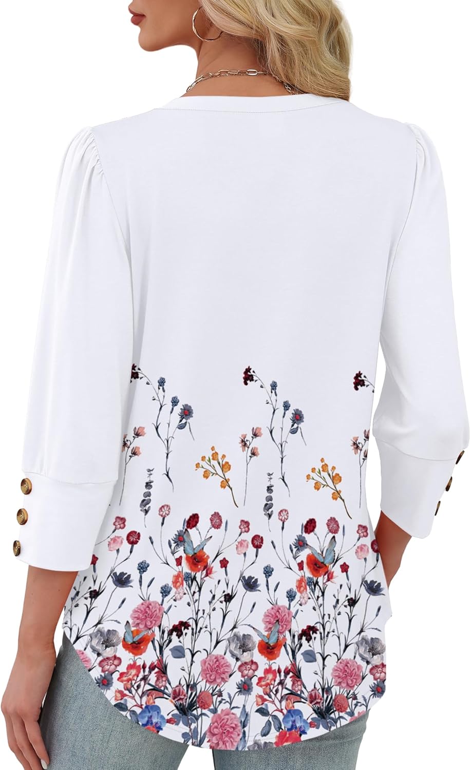XIEERDUO Womens 3/4 Sleeve Tops with Buttons V-Neck Summer Outfits Casual Blouses Shirts Beach Vacation Fall Clothes 2025