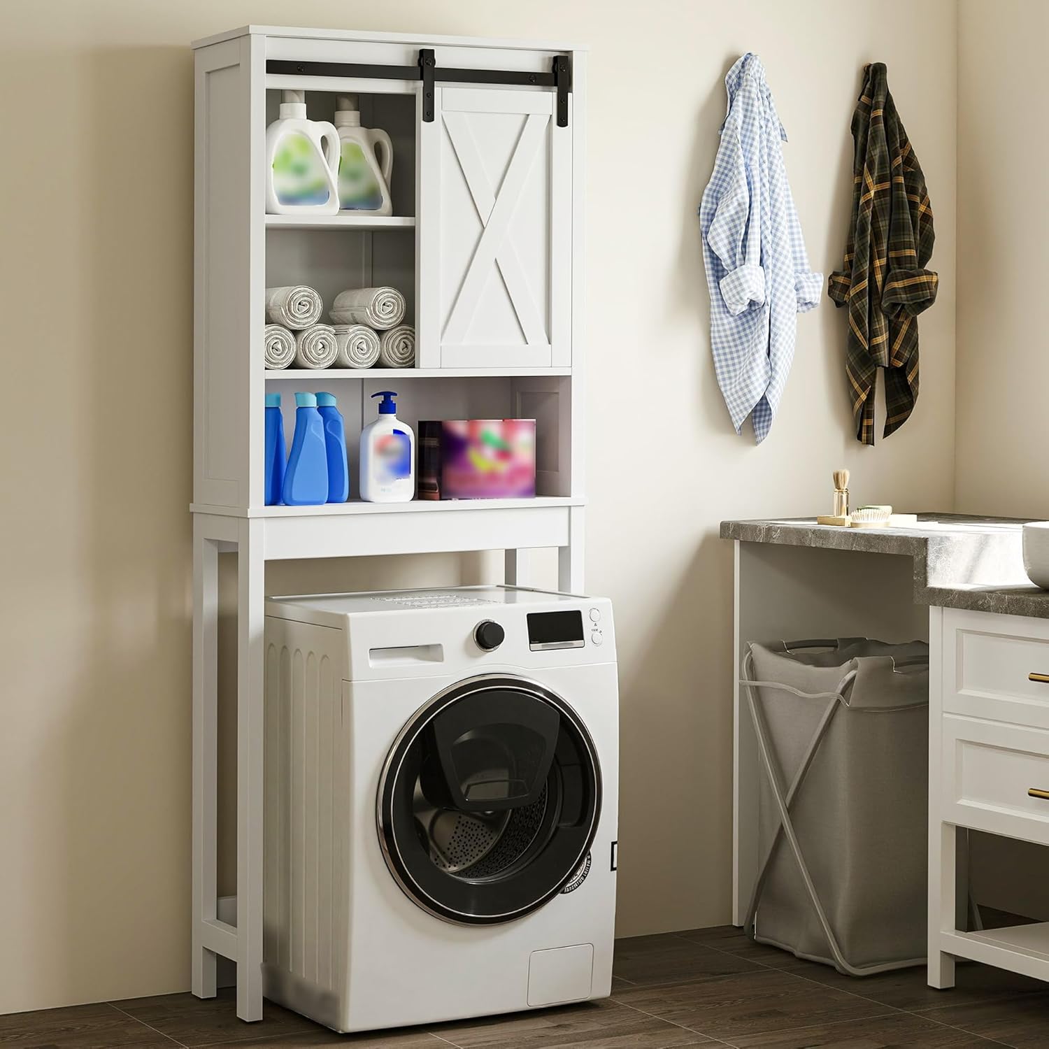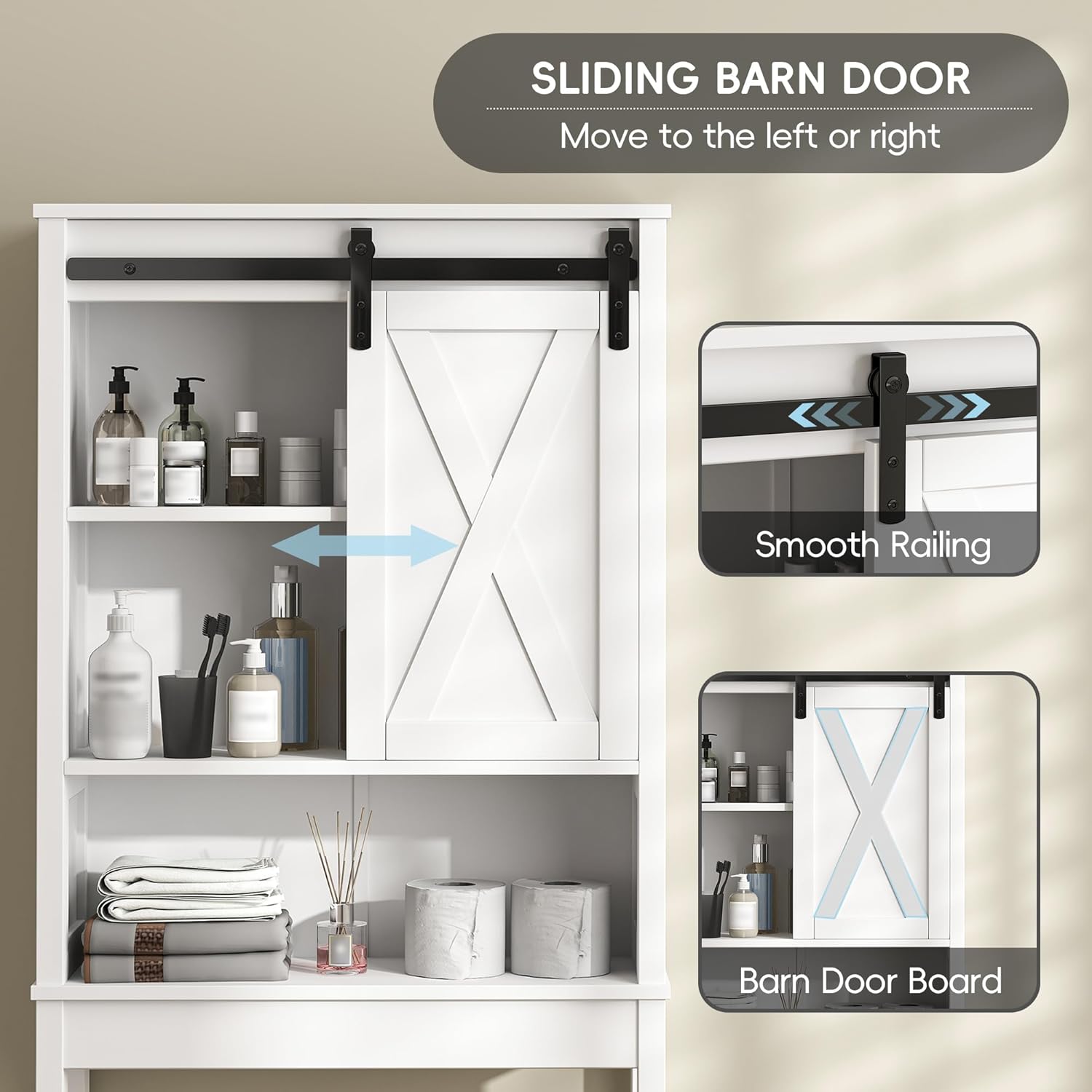 Xilingol Over The Toilet Storage Cabinet, Farmhouse Bathroom Storage Cabinet with Sliding Doors and Adjustable Shelf, Space-Saving Over Toilet Storage, White
