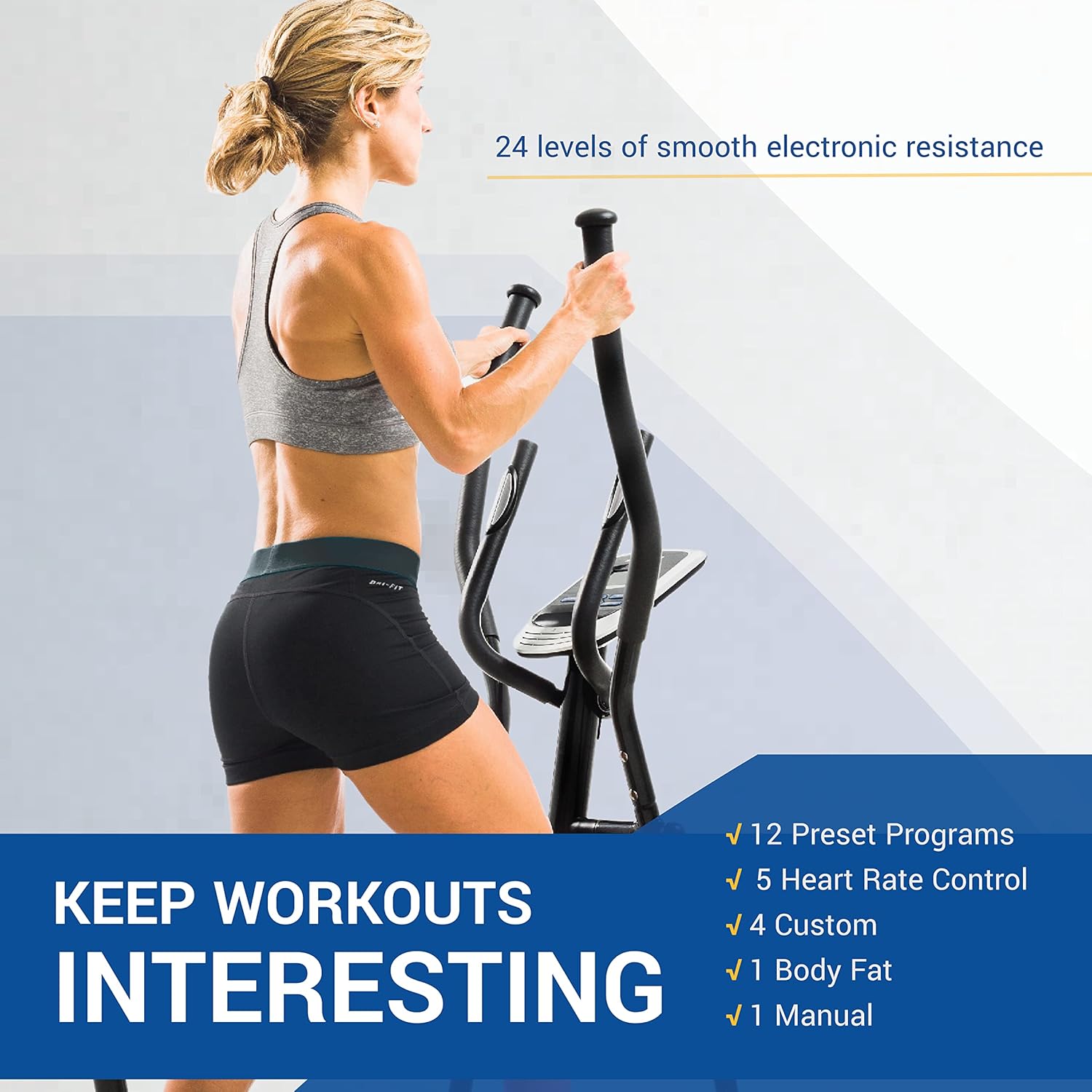 Motivating programs include manual, 12 preset, 4 user designed, 1 body fat, and 5 heart rate