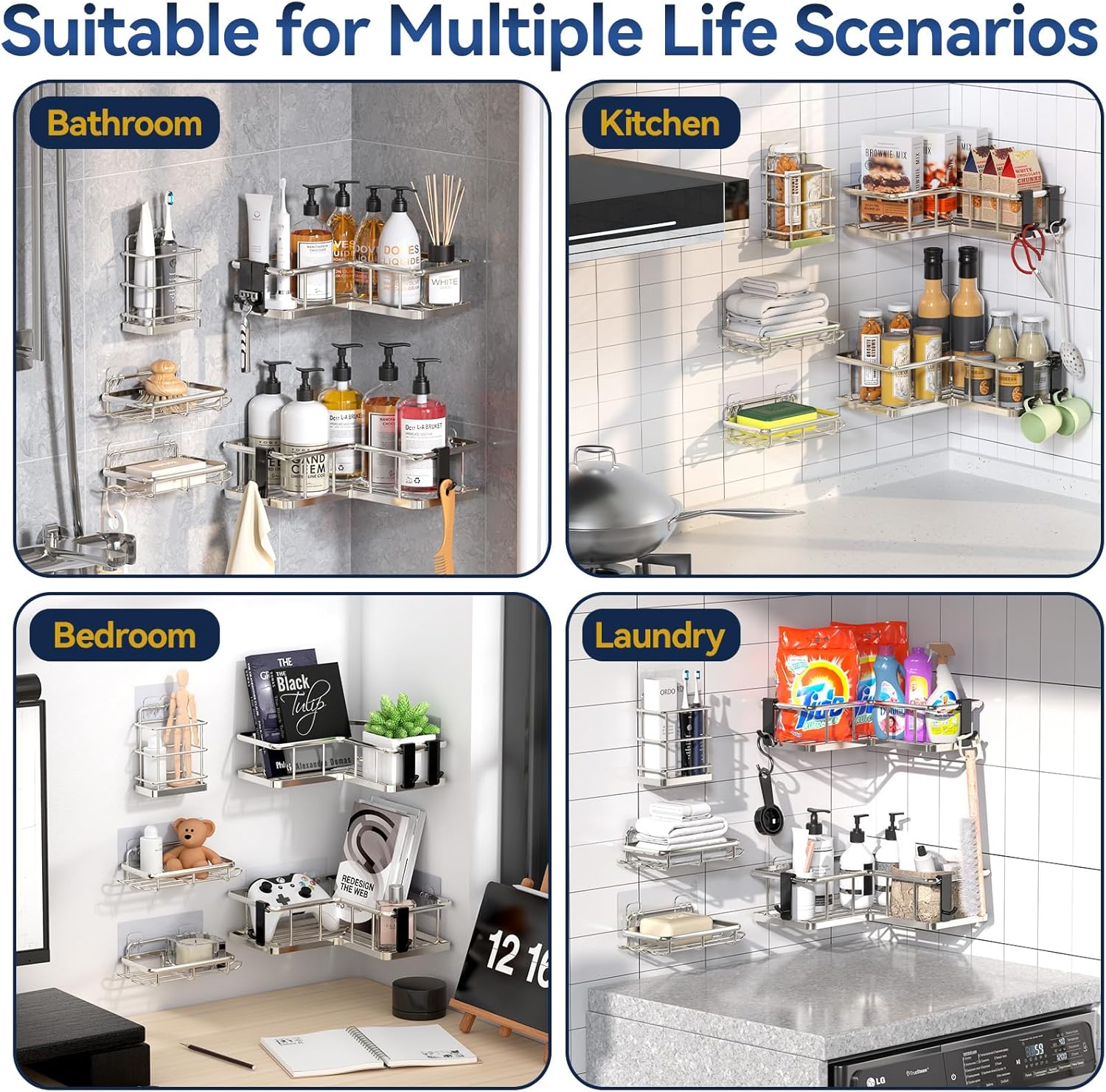 5-IN-1 SHOWER ORGANIZER SET:Upgraded L-shaped corner shower shelf maximizes unused 90° wall space with 30% larger capacity than standard models. Holds 19+ full-size shampoo bottles (40lbs) – perfect for bathroom essentials, kitchen spices, or RV storage. The ultimate shower organizer for clutter-free living