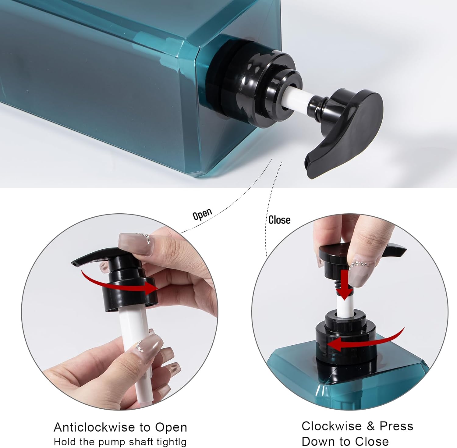 The top of the shampoo and conditioner dispenser bottles are equipped with a pump head, and liquid is easily obtained with a simple press on the pump head.