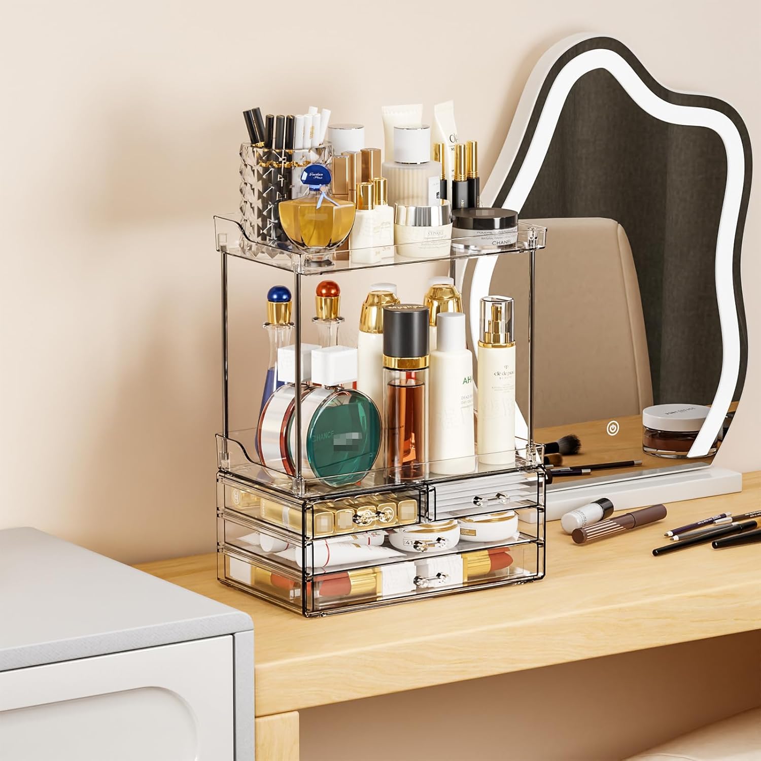 Designed with 4 drawers, this vanity organizer can hold an extensive array of beauty essentials, including Makeup Palettes, Eye Shadows, Jewelry,Makeup Brushes, Skin Care Products, Cosmetics, and makeup skincare organizer.