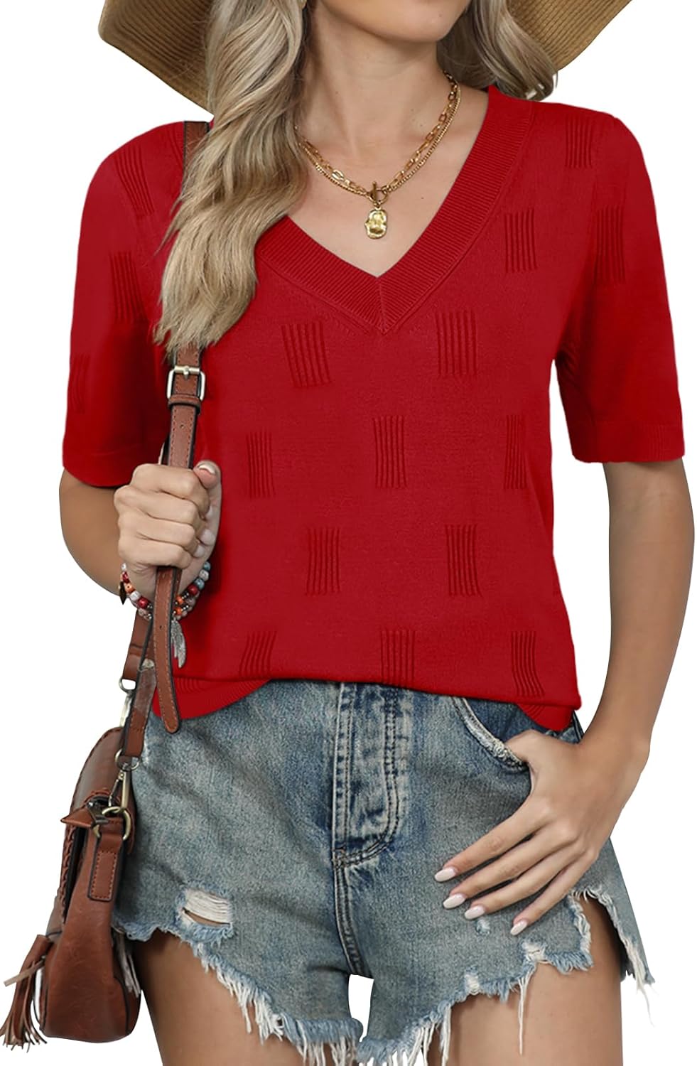 Ladies Short Sleeve Knit Top for Summer Women Casual Short Sleeve Spring Trendy V Neck Knit TopsWomen Casual Short Sleeve Spring Trendy V Neck Knit Tops
