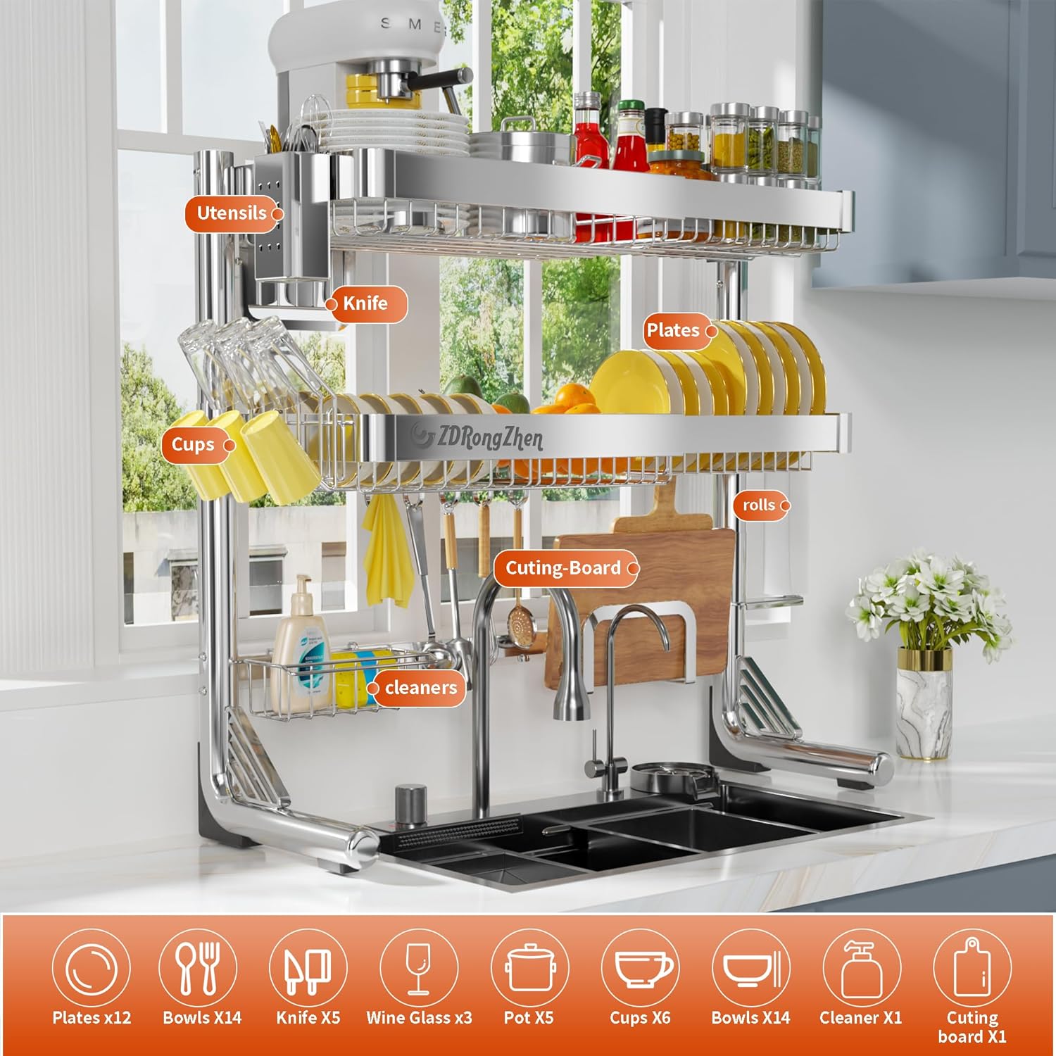 Multifunctional Design: This over the sink dish drying rack can meet most of your needs for kitchen storage. You can see his accessories with various functions in the picture.All accessories can be disassembled and adjusted to suit your needs