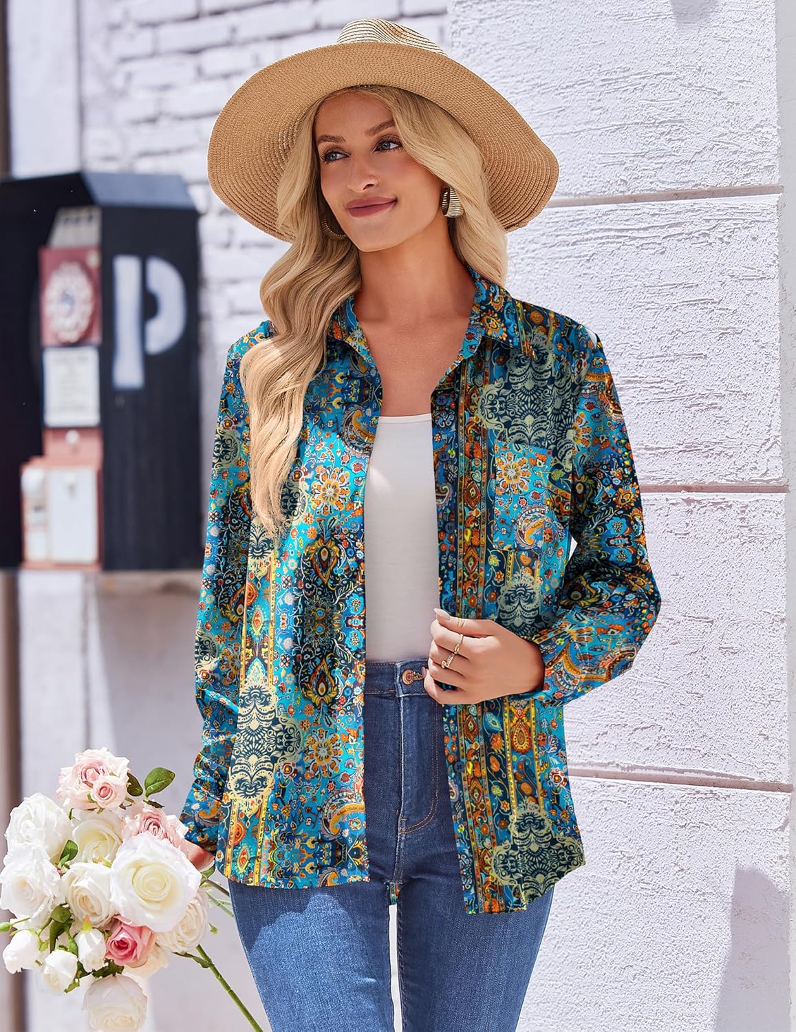 The elegant top combines timeless button-down styling with chic floral patterns, Ideal for creating effortlessly stylish casual looks!