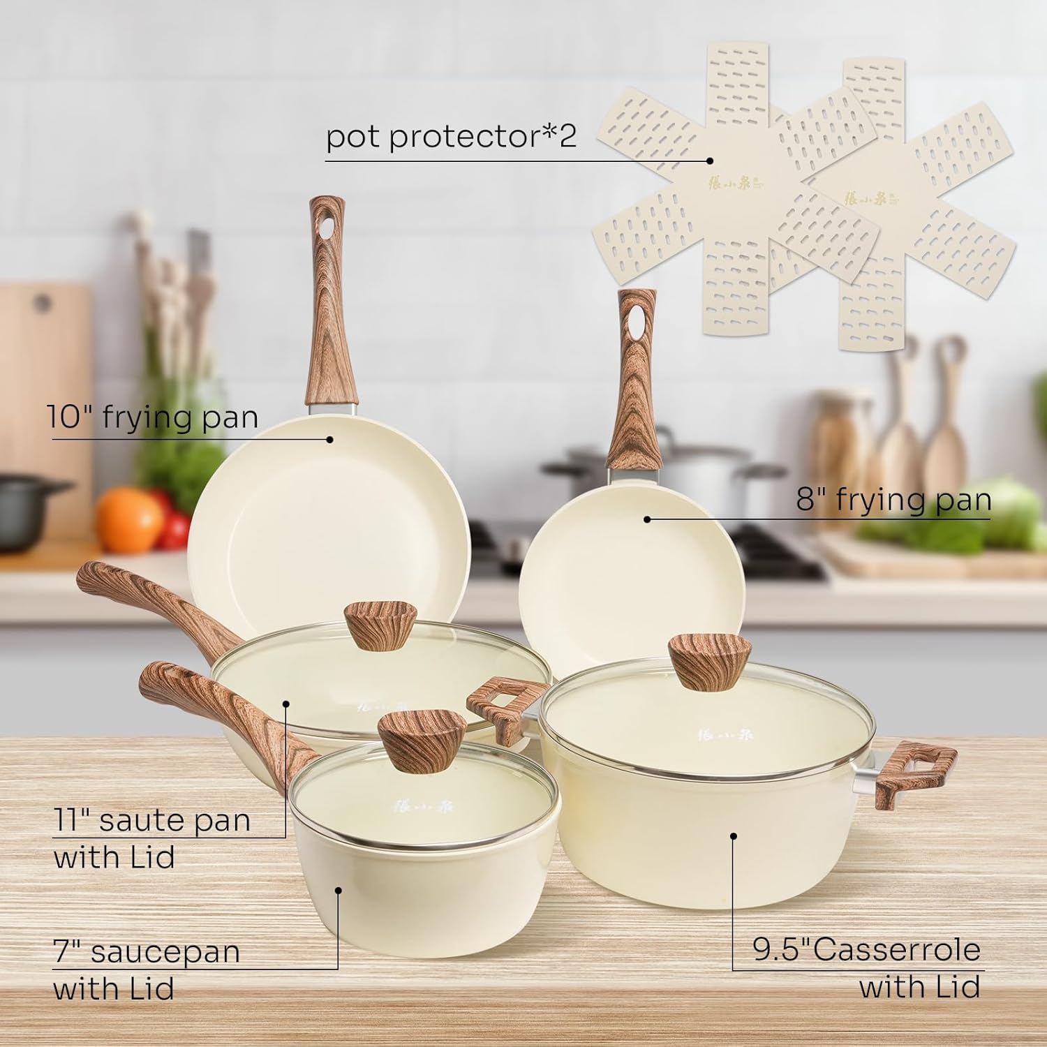 CONVENIENT CLEANING: It can be cleaned by wiping with paper or simply washing. Includes 2 frying pans (8″& 10″), one 11″saute pan with lid (4.3QT), one 7″saucepan with lid (2QT), one 9.5″casserrole with Lid (4.5QT) and 2 pot and pan protectos.