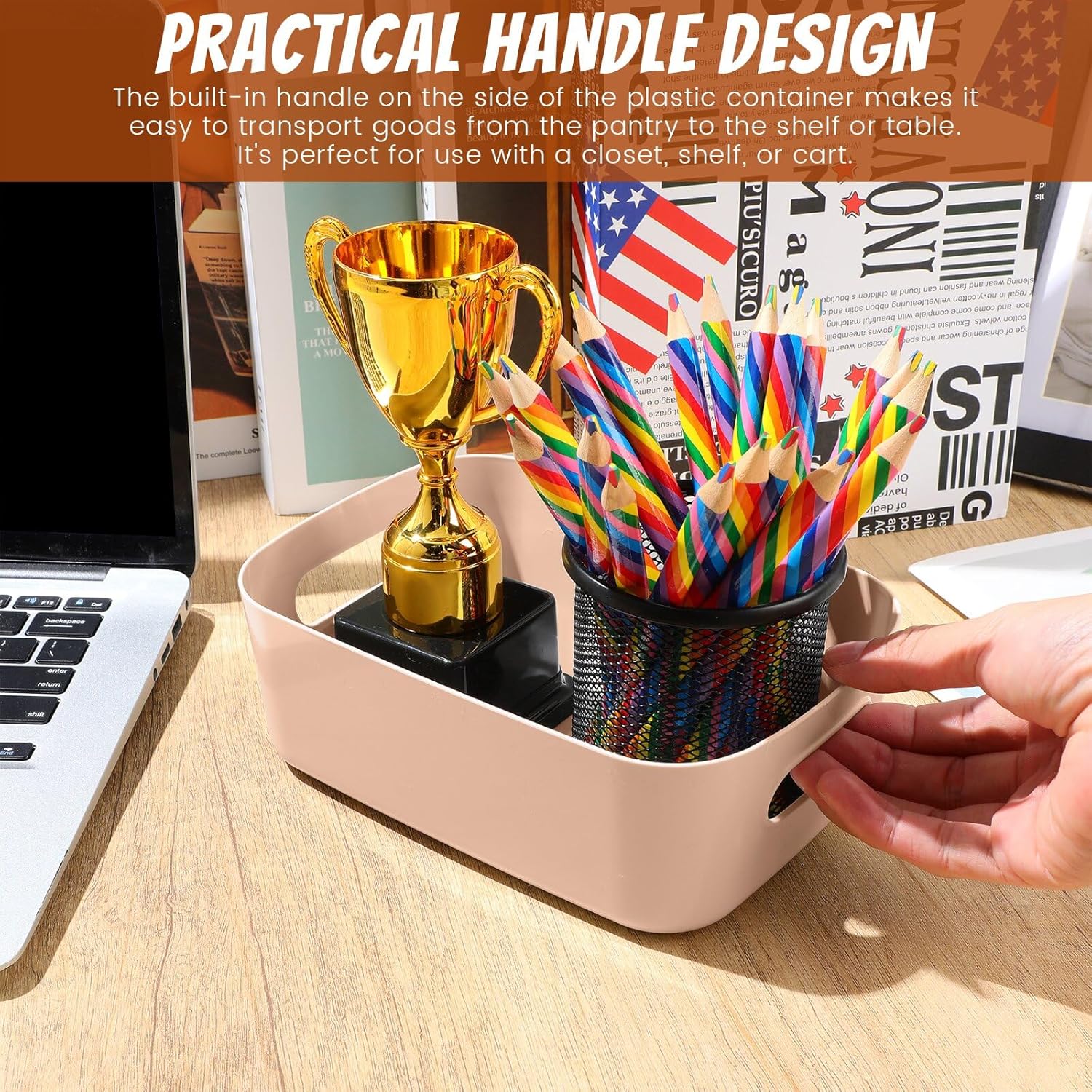 Multipurpose Storage Bin Set: you will receive 10 pieces of apricot plastic storage bins with handles, the ample quantity can certainly meet your daily storage requirements and classification needs, which can hold a lot of things, maximizing your space and making your home tidier and cleaner