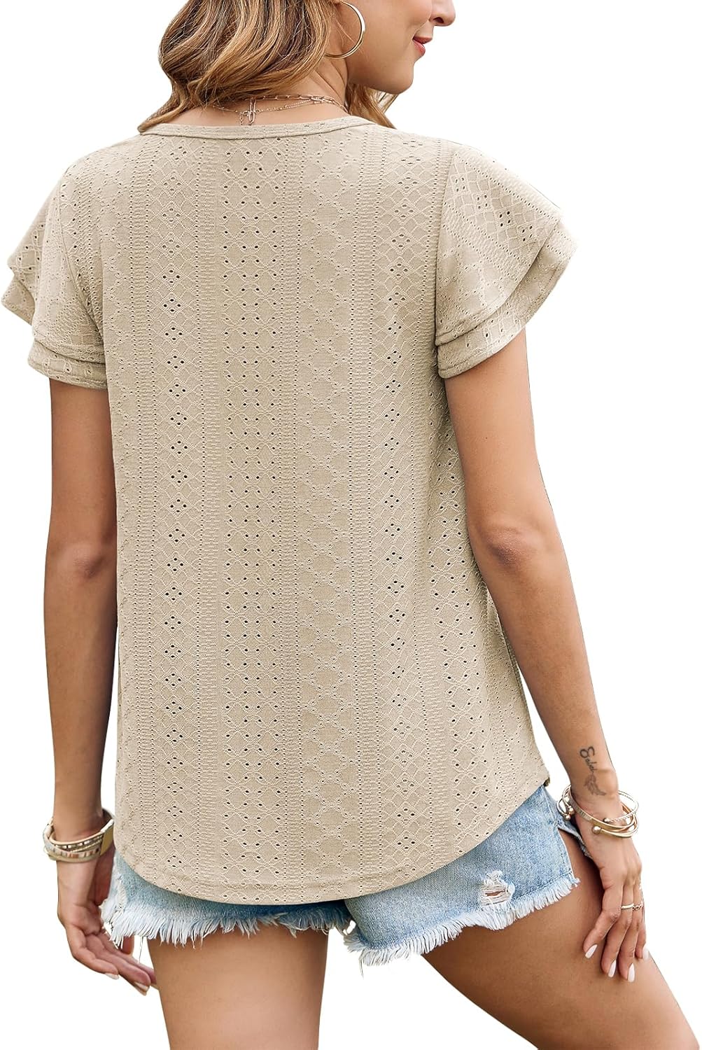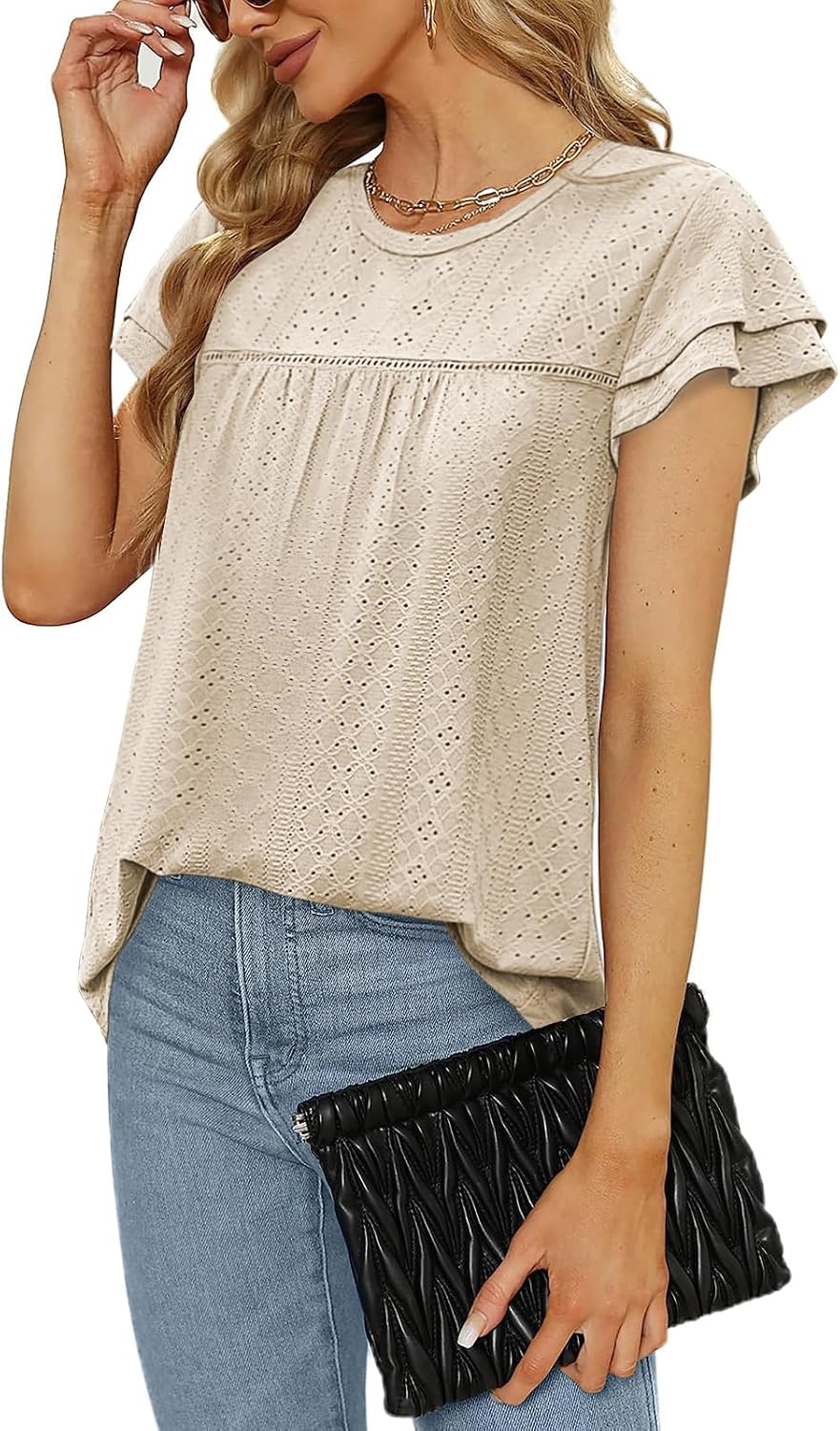 Womens Summer Tops Ruffle Sleeve Tshirts Eyelet Crewneck Loose Fit Casual Blouse