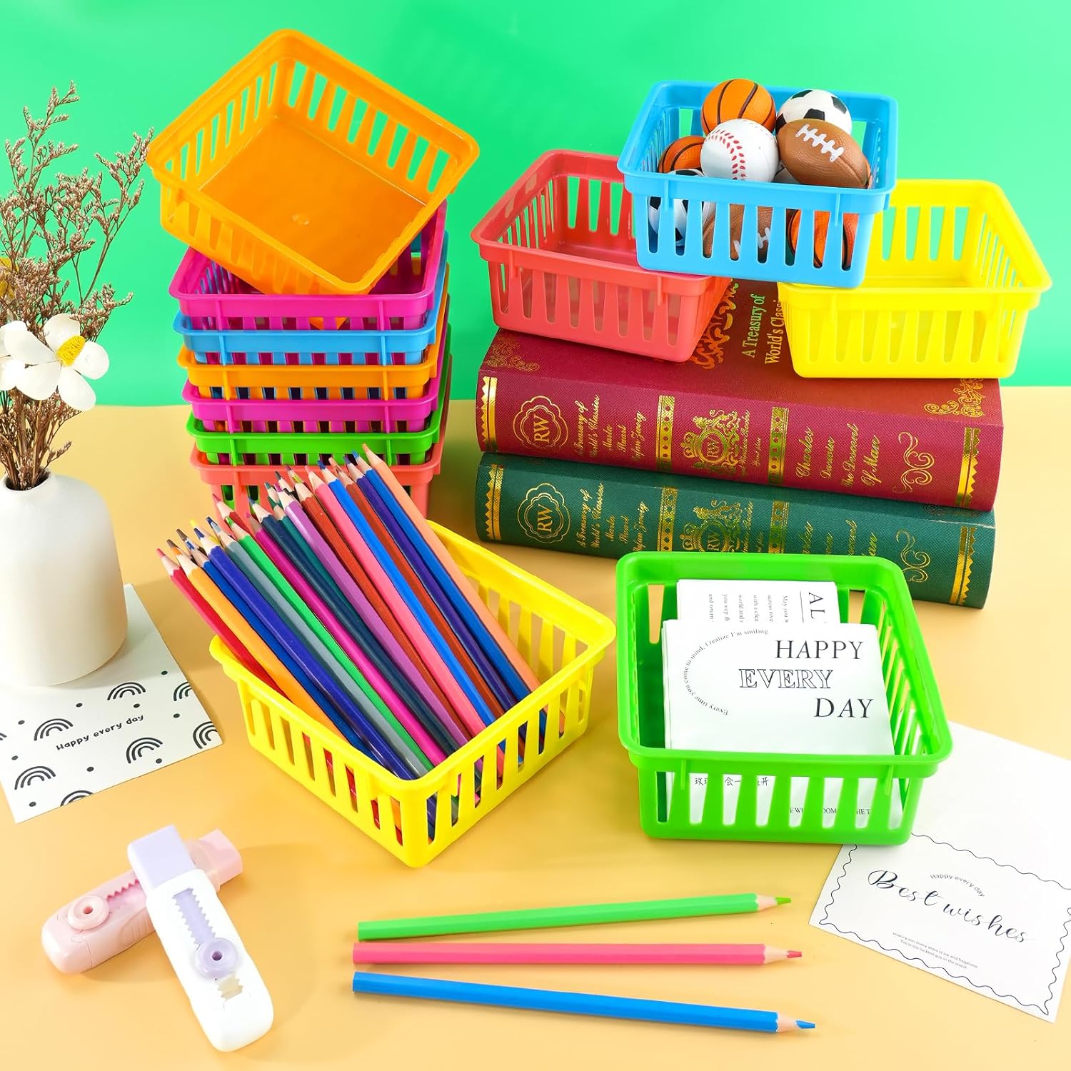 Package includes 12 packs of small colorful plastic storage baskets,These colorful plastic storage organizers trays come in 6 kinds of bright cheerful colors,sufficient quantity to meet your diverse organizing needs. Each basket measures approx. 5.3″ length x 5.3″ width x 2.5″ height, the tiny size for storing all those little things or small items that can easily get lost